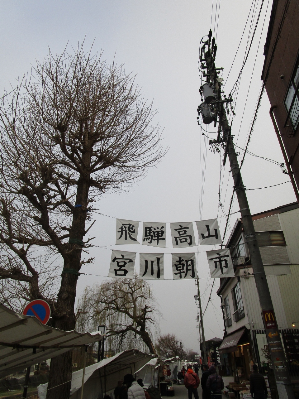 高山駅から徒歩で10分程度の場所にあります。宮川沿いに白いテントが一直線に並んでいて、野菜や果物、民芸品などが販売されていました。地元のお年寄りとの会話を楽しみながら買い物をするのも楽しみの1つだと思います。