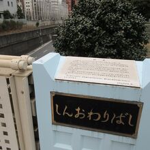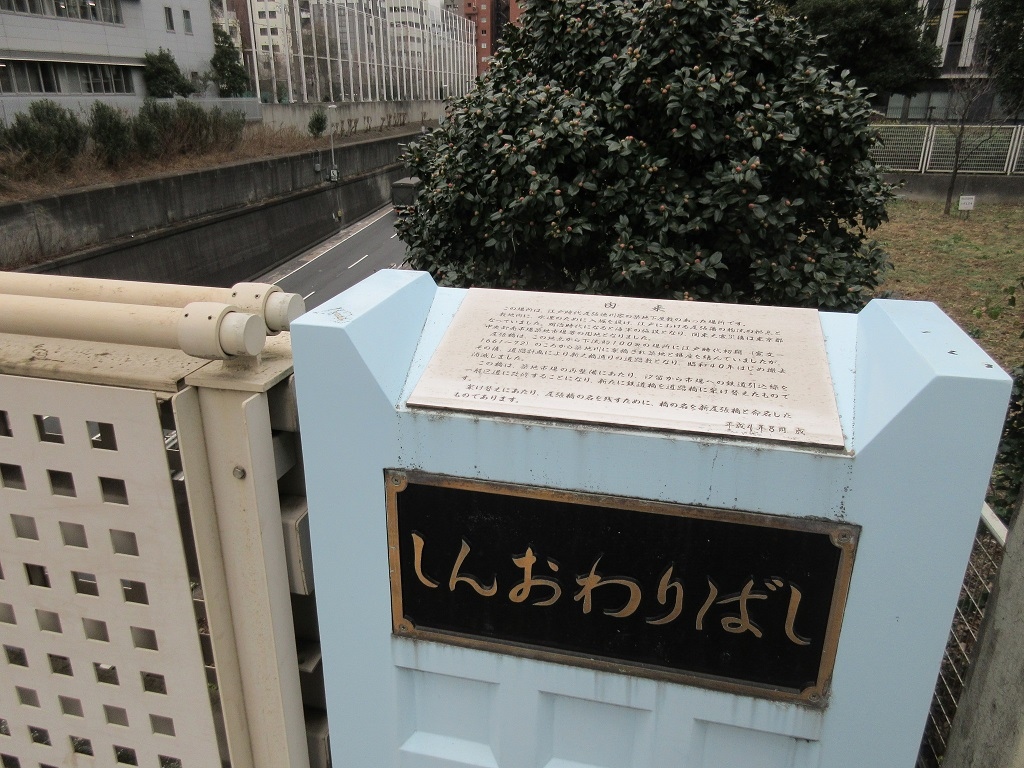汐留方面から築地方面に向かってすすむと、ベルサール汐留ビルの脇から朝日新聞社に向かって架けれた橋があり、それが【新尾張橋】でした。橋の袂には由来を示した説明板が設置されていて、この場所の近くには江戸時代に尾張徳川家の下屋敷があったことが記載されていました。歴史のある橋なのでしょうが、今は何の変哲もない都会の橋の一つでした。
