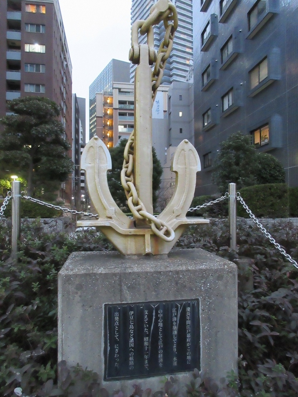 八丁堀界隈を散策した際に、こちらのモニュメントを見学しました。南高橋の東側の水面に近いテラスにあると思って探したのですが見当たらず、階段を上に一段上がった場所に大きな錨のかたちをしたモニュメントがあり、それが【江戸港発祥の地碑】でした。金色のモニュメントは存在感があり、江戸時代末期に何そうもの船が着く様子など、想像を掻き立てられました。
