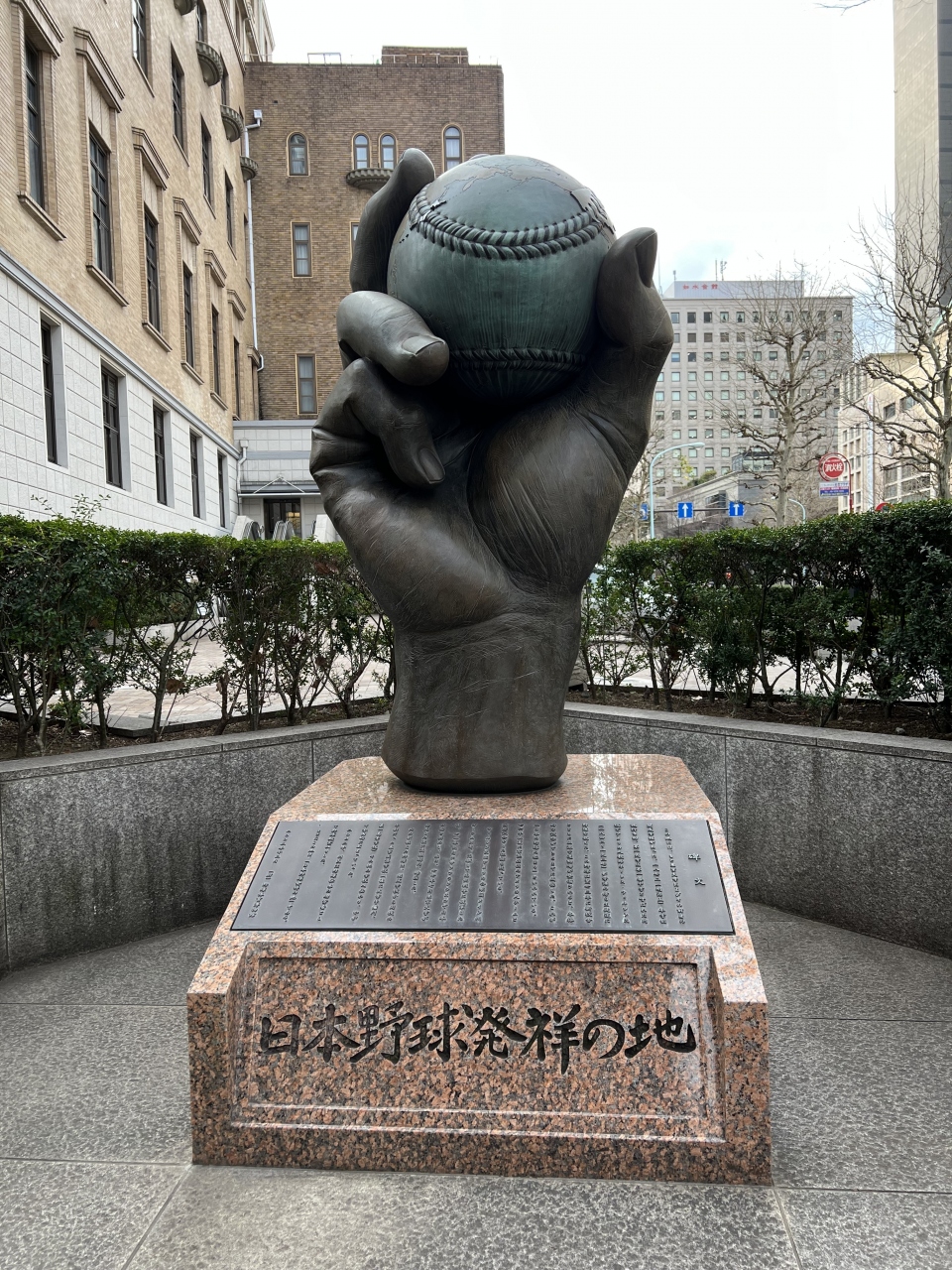 ボールを握る大きな右手のブロンズ像です。