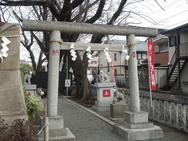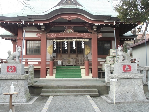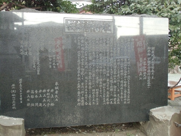 説明碑文によると、創建は不詳ですが、。弘化2年(1845)熊野神社において熊野三社大権現を勧遷し、五穀豊穣祭りを行った際、熊野神社の厄除け鬼門除けとして稲荷が祀られ建立されたとされます。
