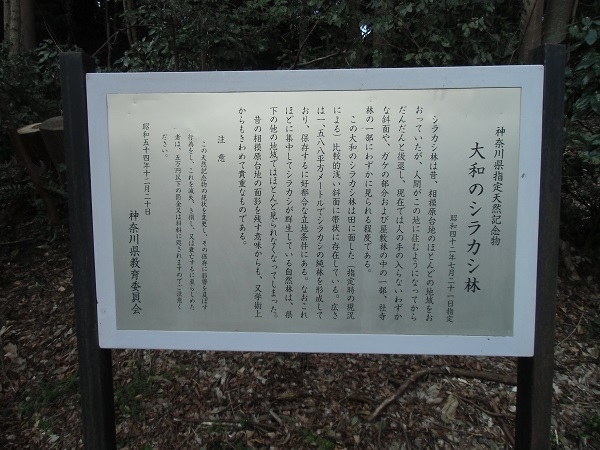 説明板によると、シラカシ林は昔、相模原台地のほとんどの地域を覆っていましたが、人間がこの地に住むようになってからだんだんと後退し、現在ではわずかなに見られるレベルになっています。