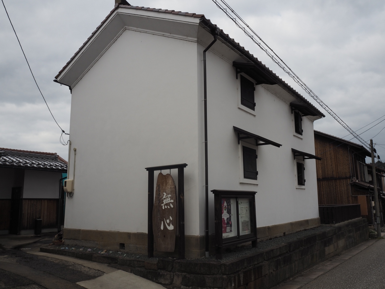 無心は倉吉の旧市街にある白壁土蔵を利用した美術ギャラリーです。1世紀前の銀行蔵を再利用したものです。無料で見学ができます。訪れた時は現代美術的な展示が多かったようです。無心の建物は外から見ると2階建ての建物ですが、中は吹き抜けになっていていて、銀行蔵であったという名残りで天井の木の梁や柱などは見事でした。
