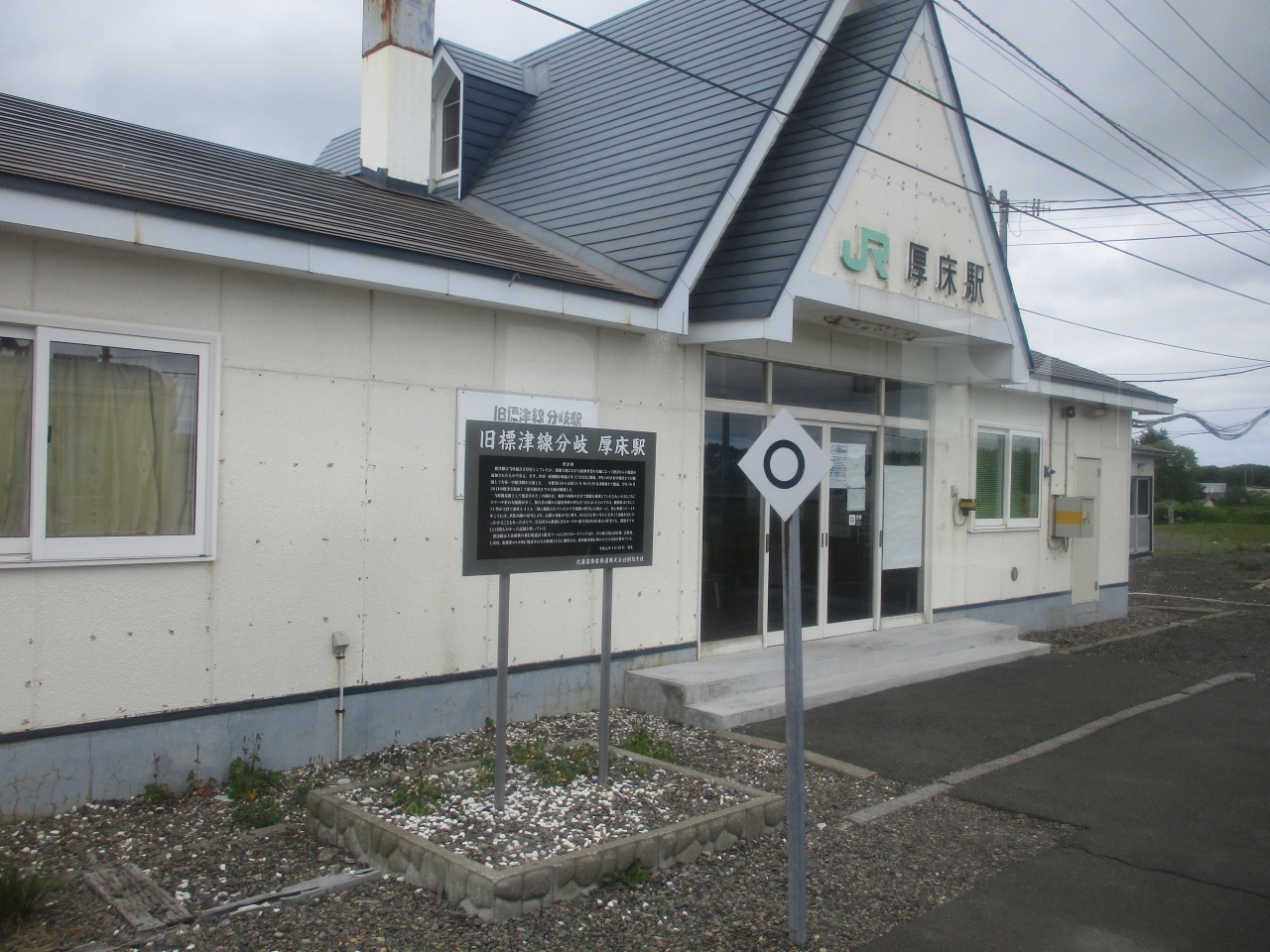 ひと昔前は標津線がこの駅から分岐していて、別海や中標津まで結んでいた名残でしょう。花咲線としてはすっかり数ある途中駅になってしまいましたが、標津線の代替バスはここ厚床駅前から発着していましたし、かつて標津線が分岐していたことを示す看板がありました。