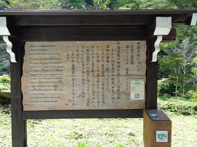 平湯温泉にある日本の滝百選に選ばれている滝で,落差は64mだそうです.平湯温泉は,甲斐の軍勢が飛騨に攻め入ったとき,この滝の下に現れた白猿が甲斐の軍勢を温泉に導いてくれたそうです.なかなか立派な滝ですが,残念ながら駐車場の先が通行止めになっていて,滝壺までは行けませんでした.