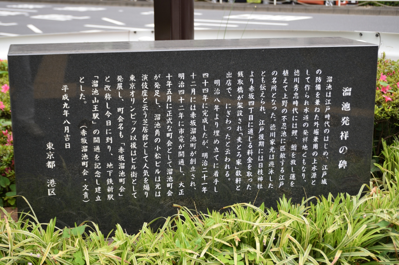 溜池はかつて江戸城の堀の外側にある防御施設として作られた水溜でした。後に江戸の集落の水道の原点にもなっており、今に至っています。水辺に該当するのものは今はほとんど残っておらず碑には歴史が書き連ねられています。
