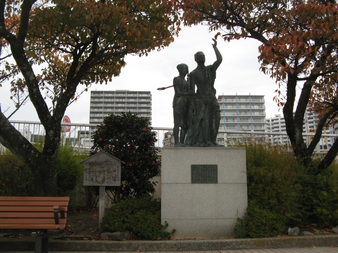 JR熱海駅から歩いて15分ほど、熱海サンビーチと熱海親水公園の間にあるムーンテラスの根元の階段に「釜鳴屋平七夫妻像」が建っていました。現地にあった説明板によると釜鳴屋平七は安政の頃まぐろ網の権利を巡って起こった漁民一揆の首謀者として捕えられ島流しとなり35歳の若さで亡くなった人物で、それを顕彰するために建てられたものだそうです。像が平七単独でなく夫婦で寄り添うように造られているのが良いと思いました。