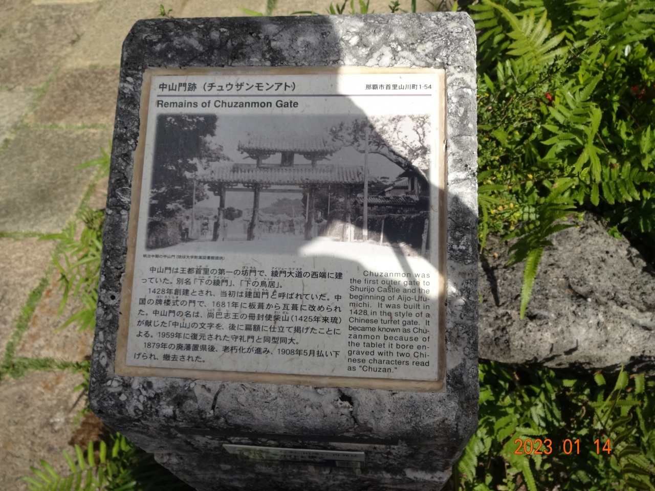 首里高等学校の西側に石碑(旧跡の案内表示)がありました。首里琉染というお店の前です。かってここに、中山門があったそうです。1428年の首里高等学校の西側に石碑(旧跡の案内表示)がありました。首里琉染というお店の前です。かってここに、中山門があったそうです。1428年の創建とされていて、当初は建国門と呼ばれていたそうです。老朽化が進み、1908年に撤去されとか。つまり、約100年前までは、ここに門があったのですね。創建とされていて、当初は建国門と呼ばれていたそうです。老朽化が進み、1908年に撤去されとか。つまり、約100年前までは、ここに門があったのですね。
