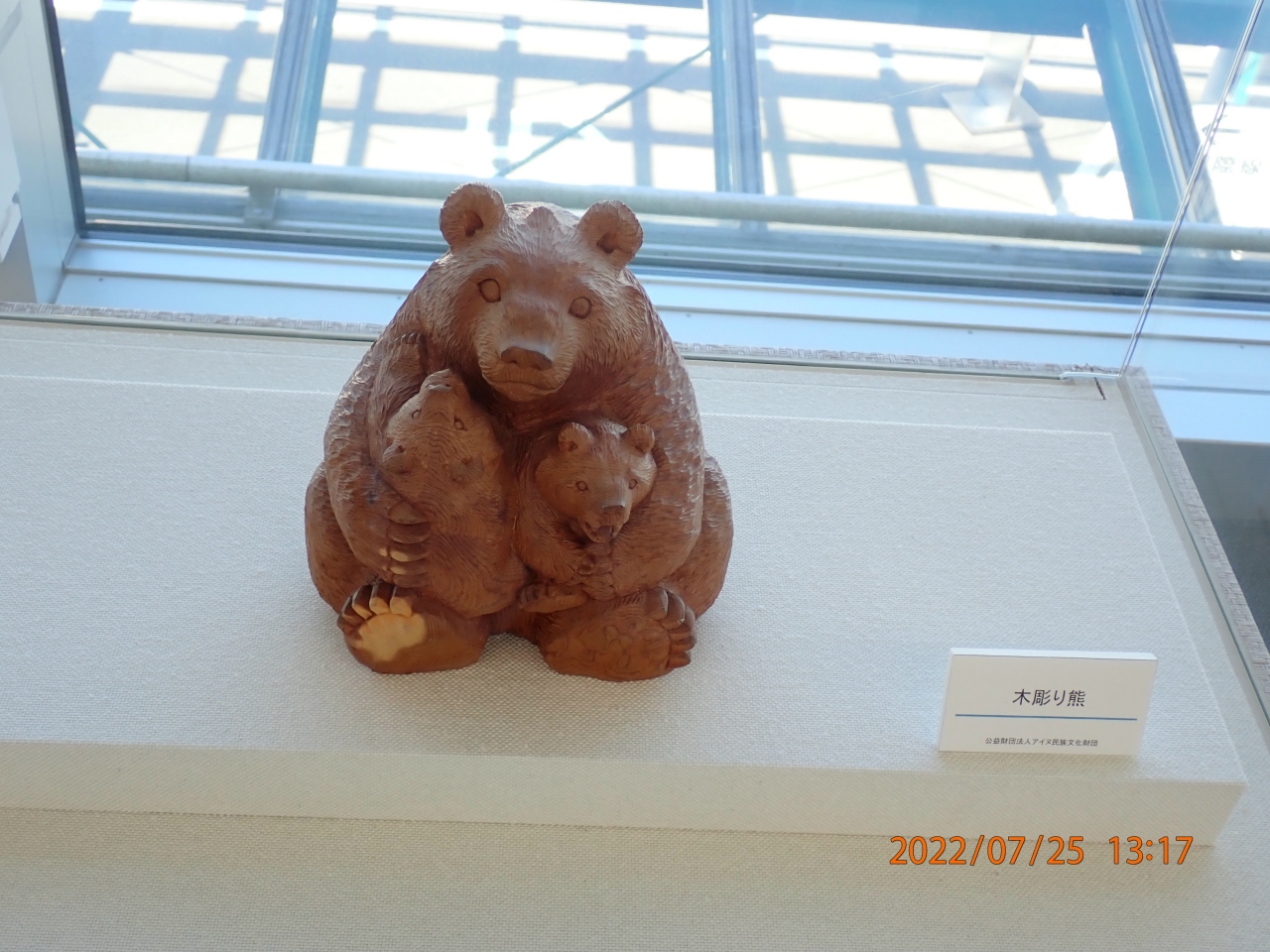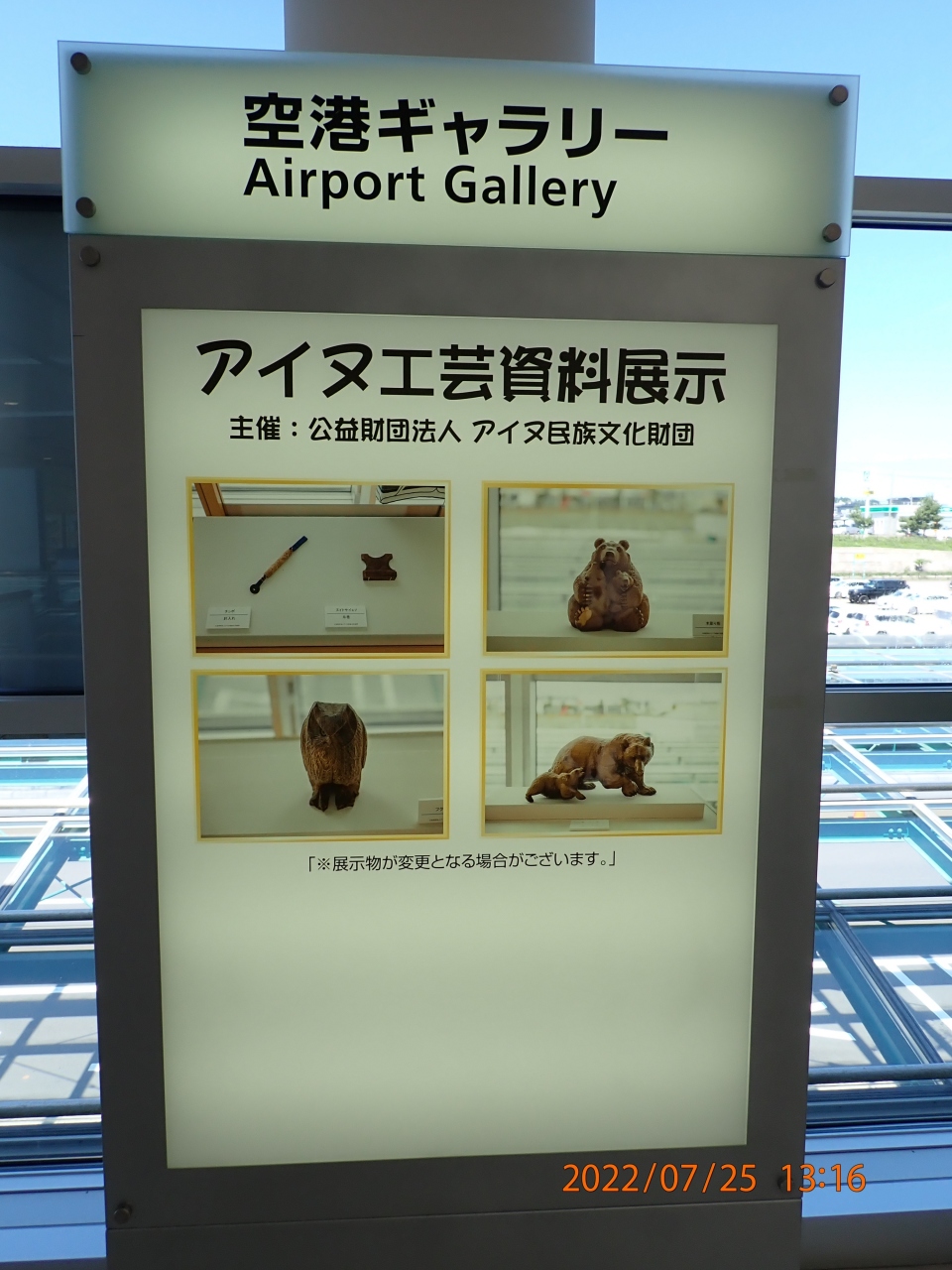 函館市観光で立ち寄りました。空港ギャラリーは、名前の通り函館空港の建物内にあります。2階の出発ロビー階にあり、細長い展示スペースで、アイヌ工芸品の資料展示を行ってました。お馴染みの木彫りのクマの親子やフクロウの彫り物、アイヌ独特の色や文様の衣装などが展示されてました。