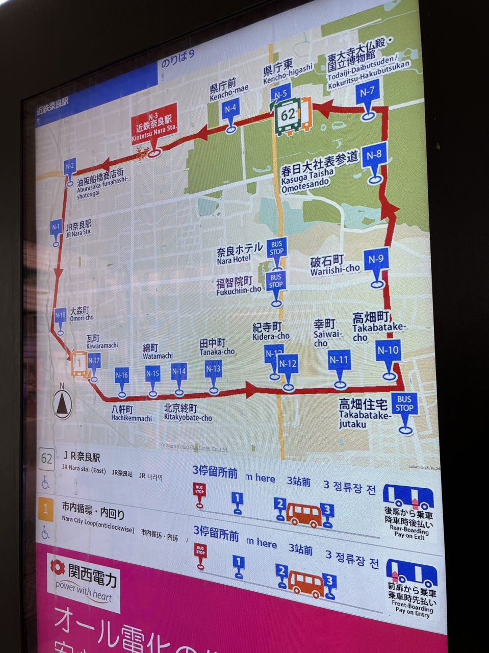 運賃220円とまあそれなりです。今回足の調子が悪くて、近鉄奈良駅から、JR奈良駅という近距離乗車をしました。9番線で待ってると、大きなスクリーンがあって、待っているバスの現在地がよくわかります。観光客にも親切ですね。