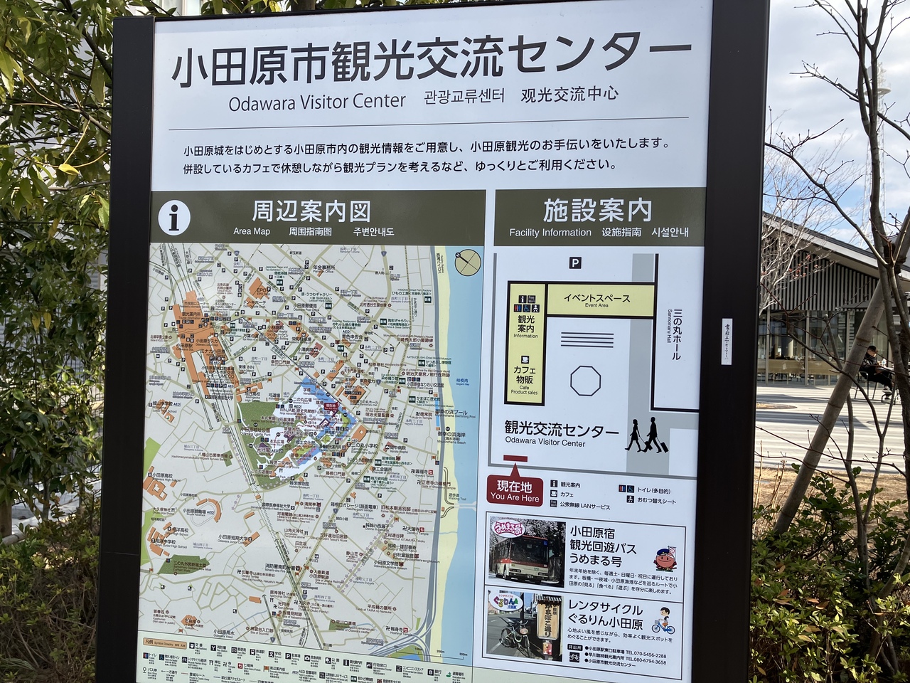 小田原城址公園の馬出門の前にある施設です。すぐ横には小田原三の丸ホールもあります。とても綺麗な建物で、中に入るとカフェがあり、軽食やスイーツが販売されていました。観光マップなども置いてあり、スタッフの方も親切そうでした。寄木細工などの体験コーナーもありました。