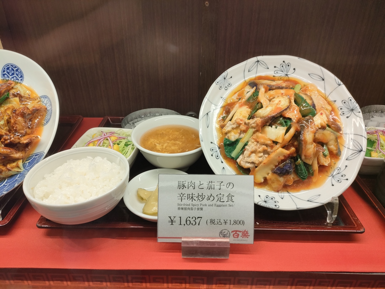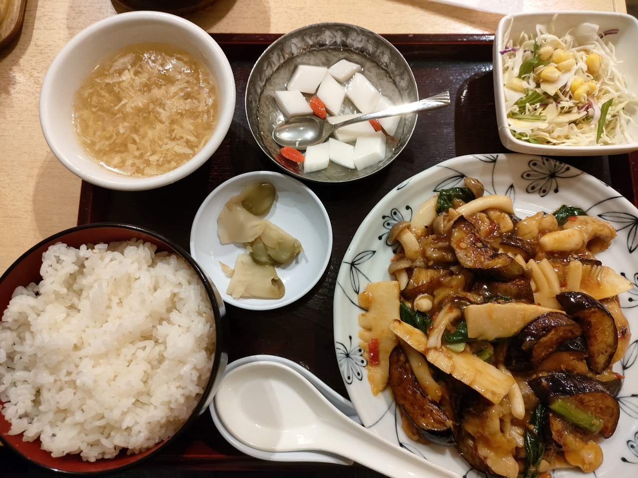 今回は「豚肉と茄子の辛味炒め定食」を注文。ピリ辛ですが辛すぎず美味しい。