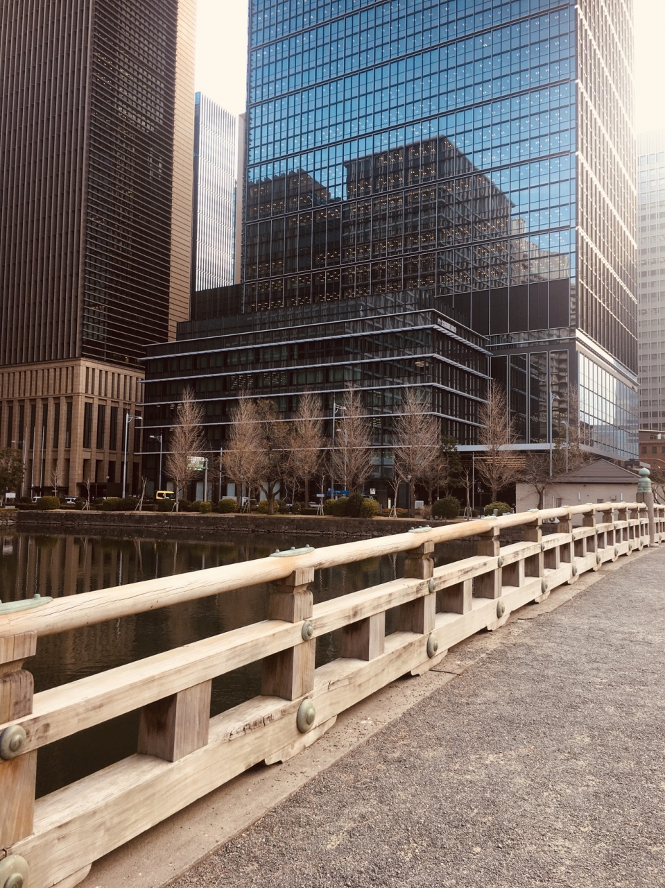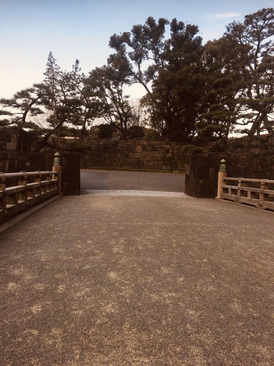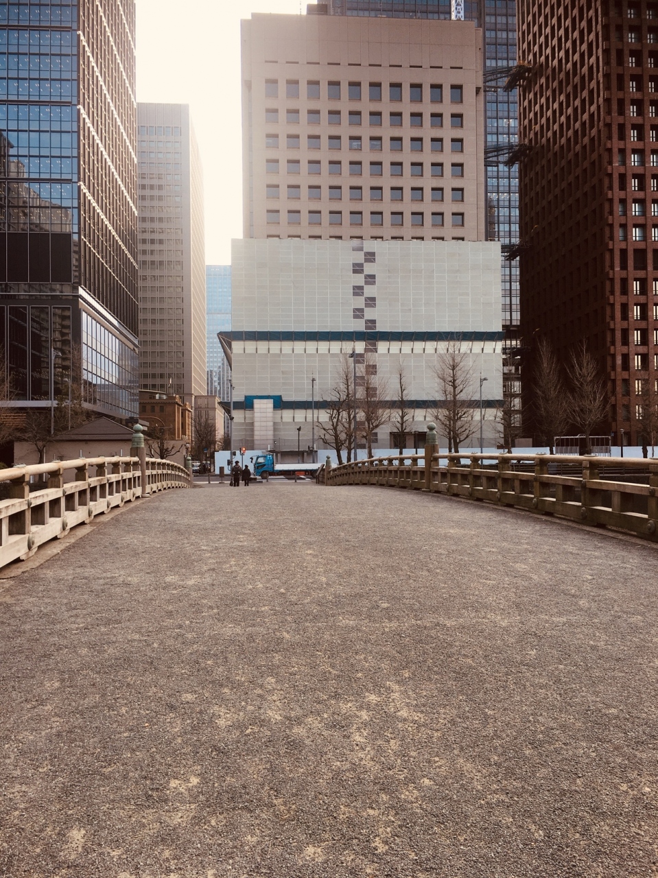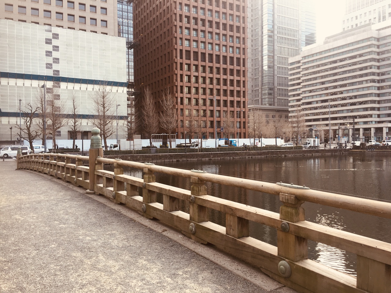 和田倉濠に架かる橋で、日比谷通りと和田倉噴水公園を結んでいます。車は通ることが出来ない、地面は細かい砂利で左右の手摺は木で、和風的な感じでした。行幸通りから見ると橋全景を見ることが出来ます。平ではなくほんの少し盛り上がっていました。