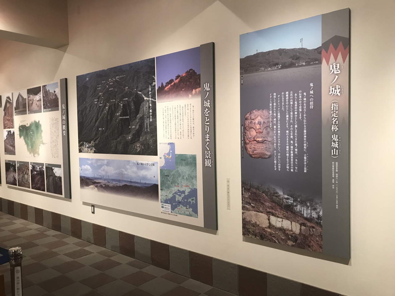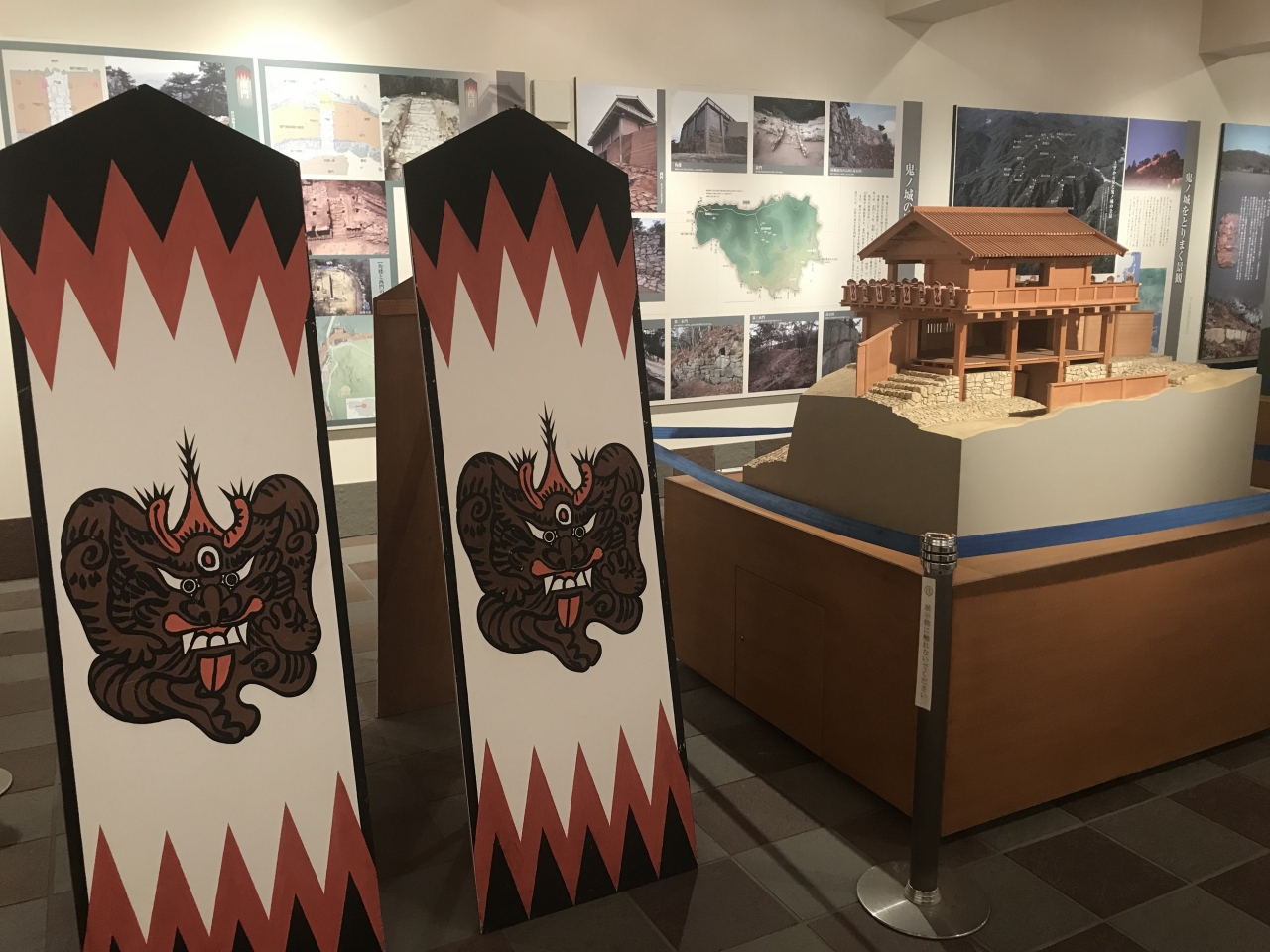 鬼城山ビジターセンターは、観光用駐車場のある鬼ノ城入口にあります。鬼ノ城全体を1000分の1の大きさで忠実に再現したジオラマ模型や、実際の城壁から剥ぎ取った土塁の壁なども展示されていました。古代山城鬼ノ城の概要や復元の様子などが詳しく紹介されていました。また休憩所も完備されていました。