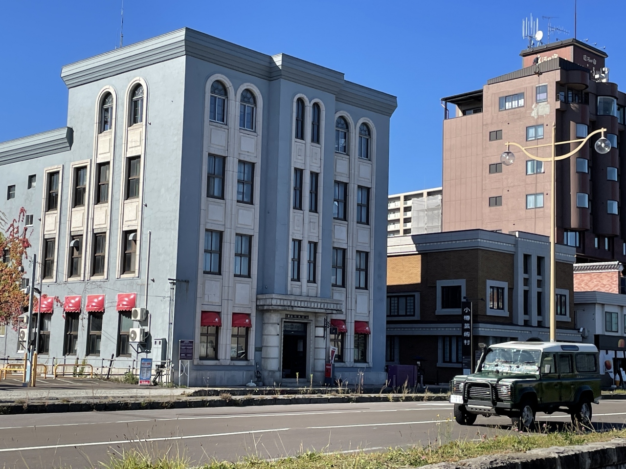 小樽芸術村のすぐ近くにあります。昭和初期に建設、鉄筋コンクリート造り4階建ての建物で小樽市歴史的建造物に指定されています。正面の装飾も美しく水色と白色の外観が目を引きます。周囲の建物とは異なるモダンで華やかな雰囲気が漂う西洋建築です。