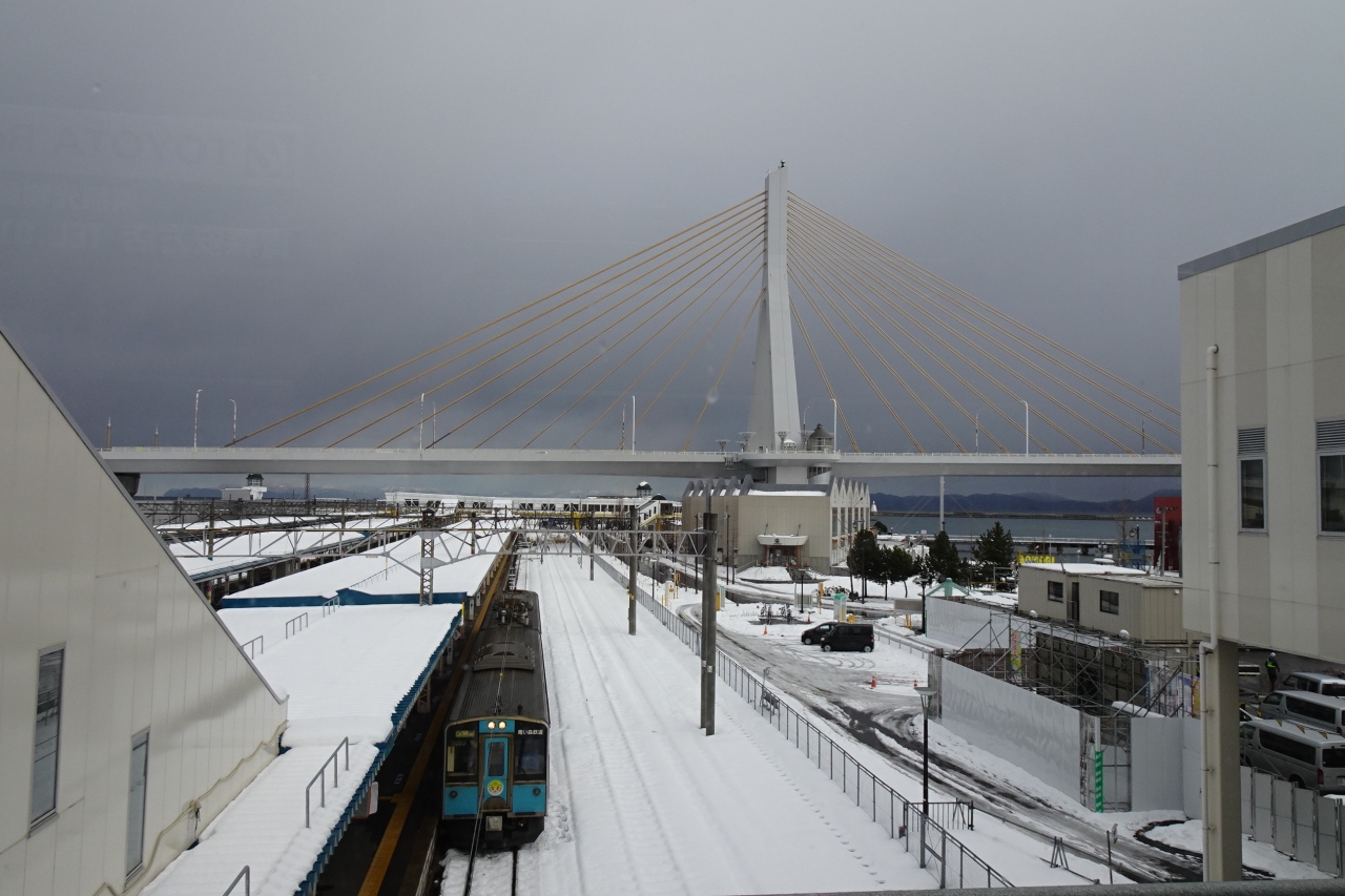 青森駅からも綺麗な姿を見ることができ、立ち止まって写真に収めている方も沢山いました。この橋と八甲田丸とのコラボ写真は大変絵になります。