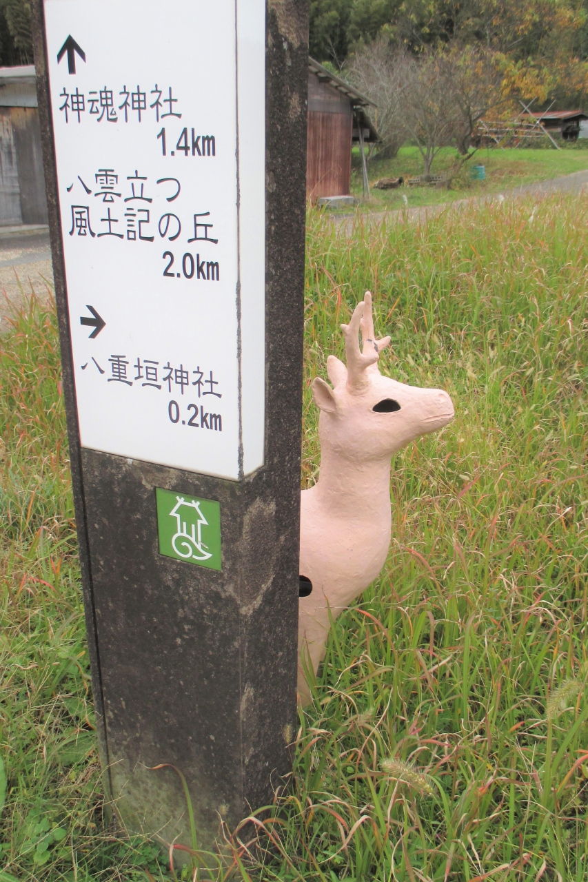 はにわロードは、古代遺跡とロマンの探求コースとのことです。古代の出雲国の中心である意宇平野にある八重垣神社、神魂神社、八雲立つ風土記の丘を結ぶ2.2kmのトレイルでした。道の分岐には案内板が立っていました。途中、八重垣神社に近い方に、八雲立つ風土記の丘展示学習館で見られる馬や鹿の埴輪のレプリカが置かれていました。訪れた時は人は見掛けませんでしたが、春や秋などトレッキングに向く季節になれば、歩く人も見られるのかと思います。