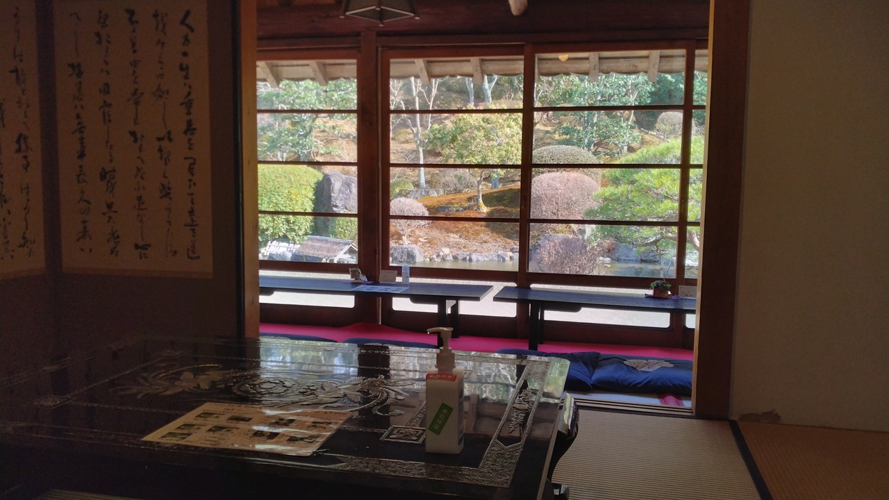 書院は吊るし雛や雛人形が飾られ、書院の縁側にはテーブルと座布団が置かれ抹茶やデザートなどがいただけるようになってます。
