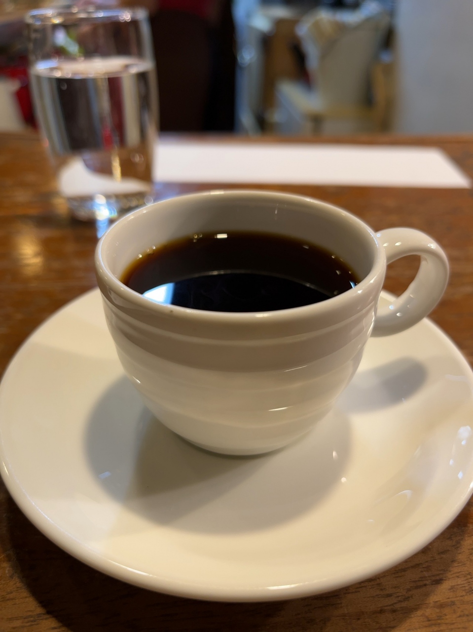 平日の昼過ぎ(14時頃)扉を開けるなり駆けつけてきた女性店員の「コーヒーだけですが、いいですかっ⁈」との詰問口調にビビりながら、「ハイ」と答えて店の一番奥のカウンター席に案内されました。店内は7-8割方席が埋まっていて、ほとんどがアジアからの観光客でした(全員が同じメニュー=ブラン・エ・ノワールというグラスに入ったカクテルみたいなコーヒーを飲んでいた!)日本人客は少数派で、私以外は常連さんのようでした。メニューを渡され、眺めたけどわからないので好みを伝えたのですが(酸味が苦手で深煎りが好き。スマトラマンデリンを普段飲んでいる)、スマトラマンデリンを勧められ、せっかくなので普段飲んでいないものをとお願いして、タンザニアというのを勧められてオーダー。デミカップで出てきて800円。関西人なので、高いなあと驚き。肝心の風味は、酸味苦手だと言ったのに酸味が強めで、思ったほど深煎りの風味がなく、好みの味では全然なくて落胆。何よりオーダーを聞いてくれた若い男性(カウンターに2人いた内の若い方の人)が愛想ないを通り越してちょっと怖くて、名店の店員が客に上から目線で接する東京独特の文化に関西人の自分はなじめなくて、店にいた短い時間、全くくつろげませんでした。量も少なかったし風味もがっかりで、店を出た後、椿屋珈琲で飲み直そうと真剣に思ったほど。老舗には当たり外れあるなぁというのが結論です。