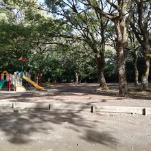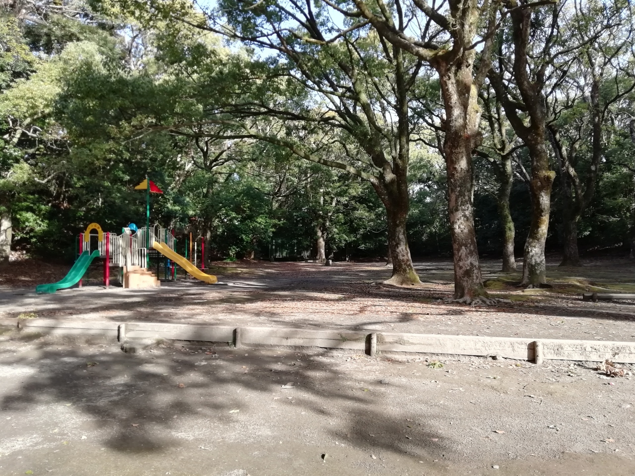 城山の上にある、遊具が置いてある公園のような場所です。ここで正午のドンを鳴らしたので、ドン広場というそうです。林の奥に、明治十年戦役薩軍本営跡の碑がありました。今は普通の広場で、子供が遊ぶような場所になっていました。