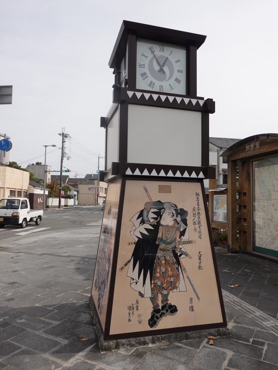「義士あんどん」は、赤穂市の市制60周年を記念して設置されたのからくり時計です。高さがあり、周囲からも目立つ立派なものです。お城通り交差点の一画にある小さな広場のような場所にあります。朝9時から夜8時まで、毎正時に扉が開き、からくり人形が忠臣蔵の名場面を演じるということなのですが、時間の関係で待つことが出来なかったのが悔やまれます。