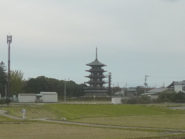 圓満寺は、JR土山駅から北北西方向に500メートルほどの場所にある真言宗寺院です。五重塔を持つお寺で、南に隣接する野添北公園側から撮影した姿がお馴染みです。一方で、この五重塔を北側から見ると、田んぼの向うに聳える姿となり、これはこれで印象的な光景です。平成になってから建設された新しい塔のようで、塔の脇に階段が設置されているのもユニークだと感じました。
