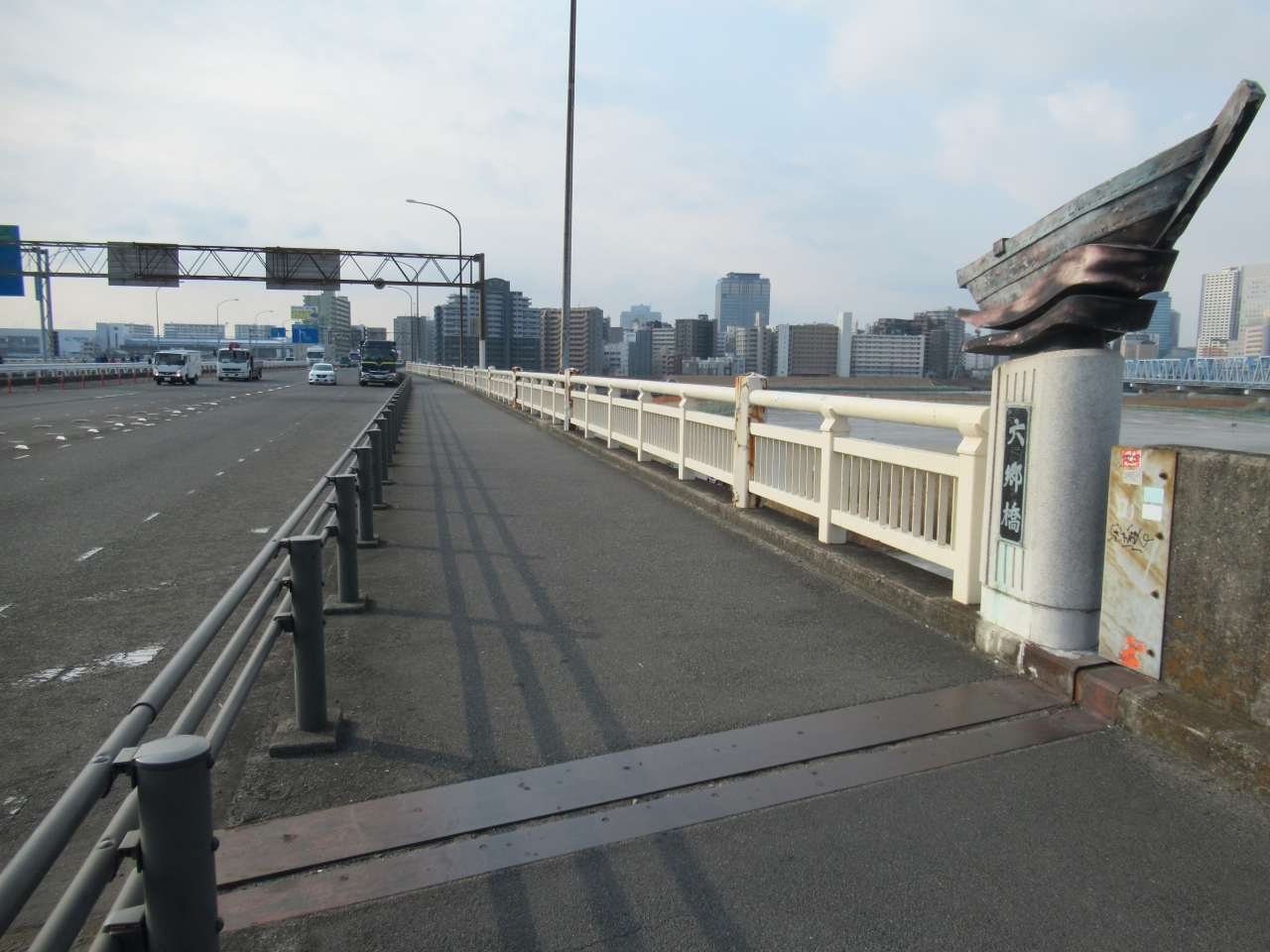 東京都大田区と神奈川県川崎市を結ぶ、多摩川に架かる450mほどの橋です。1600年に徳川家康が六郷大橋をかけたのが始まりとされる橋ですが、1688年の川の氾濫で橋が流出、その後、渡し船が利用されていました。明治に入り木造橋がかけられたものの交通量が激増し、1984年に現在の鉄橋が架けられました。橋の柱には江戸時代に利用されていた渡し船のオブジェが飾られています。現在は正月に行われる箱根駅伝の1区の勝負どころとしても知られています。