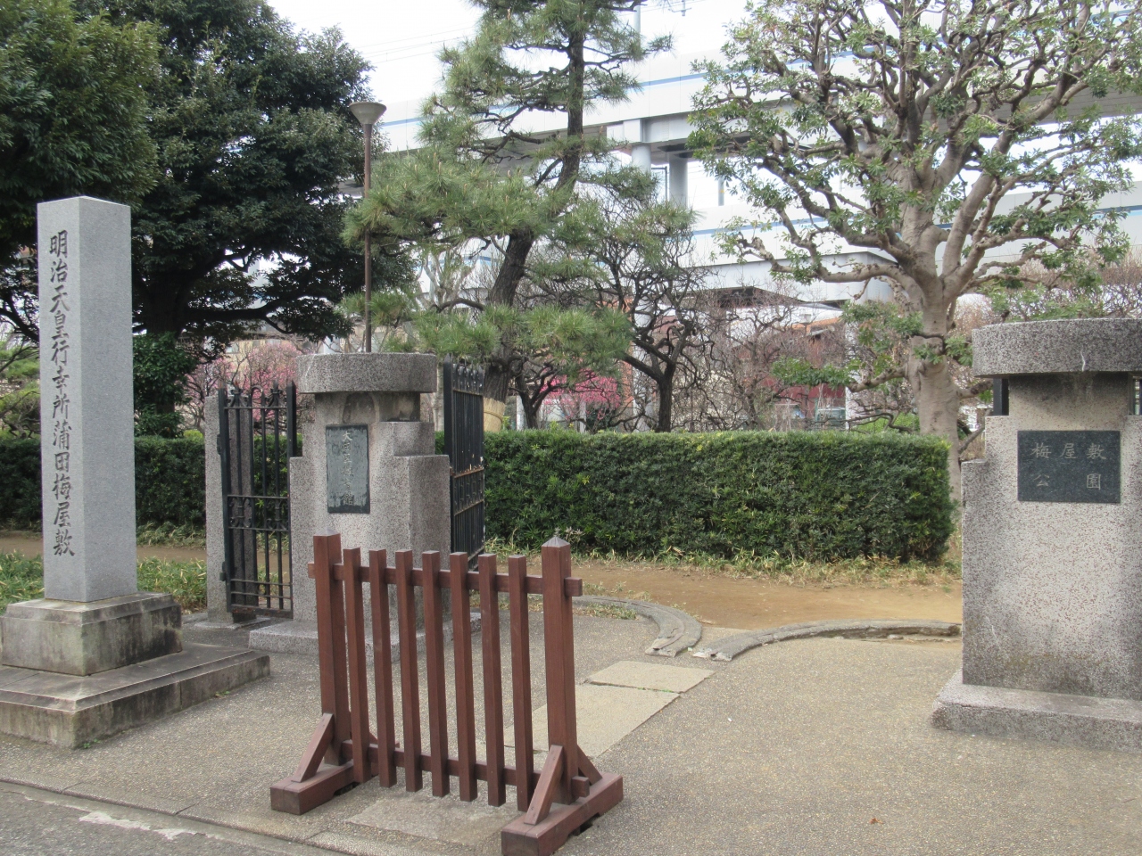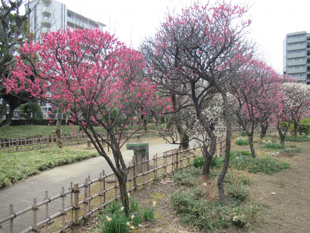 大田区総合体育館を訪れた帰りに立ち寄りました。京急蒲田駅から400mほど、第一京浜を挟んで体育館向かいに造られた公園です。江戸時代に家庭用常備薬だった和中散という薬を売っていた場所に、梅の木を植え、東海道の休み茶屋にしたことが始まりだそうです。現在も白梅や紅梅100本ほどが植えられていて、訪れた時は早咲きの梅が7分ほど花をつけていました。水仙も咲いていて、5月から6月にかけてはアヤメも咲くようです。園内にはベンチも設置されていて花見を楽しむことができました。