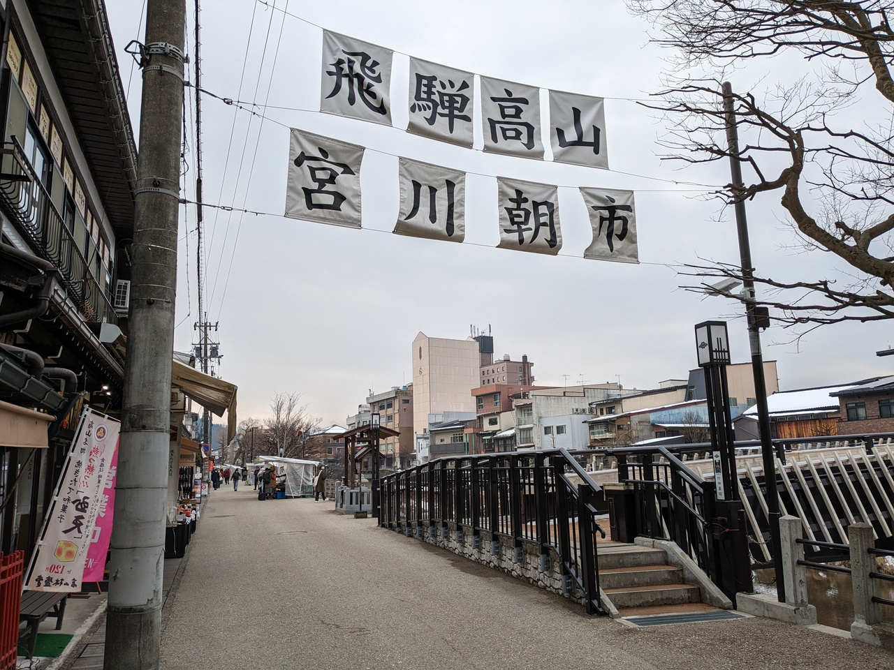 高山の朝市と言えば、陣屋前朝市と宮川朝市のふたつがあります。このうち、宮川沿いで毎朝開催されている朝市が宮川朝市です。通り沿いにはお土産屋などもありましたが、露店数は少なく、賑やかな朝市をイメージしていたので拍子抜けでした。