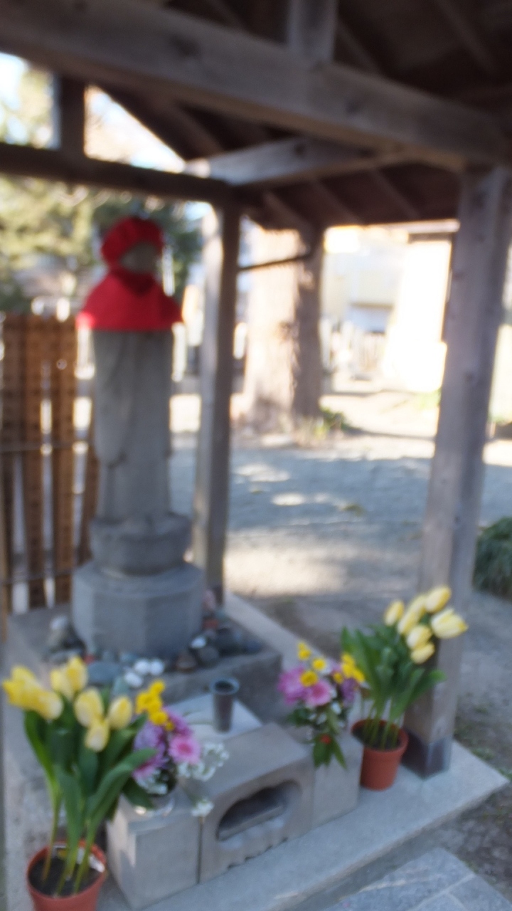 鎌倉の1月、初詣の時期に参拝したお寺の一つで、材木座方面にあり、「光明寺」という大きなお寺からすぐの場所にありますのっで一緒に参拝できます。。境内に入るとお地蔵さまに花が飾ってあったのですが、りっぱな黄色いチューリップがたくさん供えてあってきれいでした。境内には芭蕉の句碑などもあります。