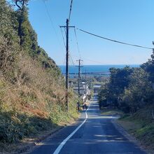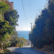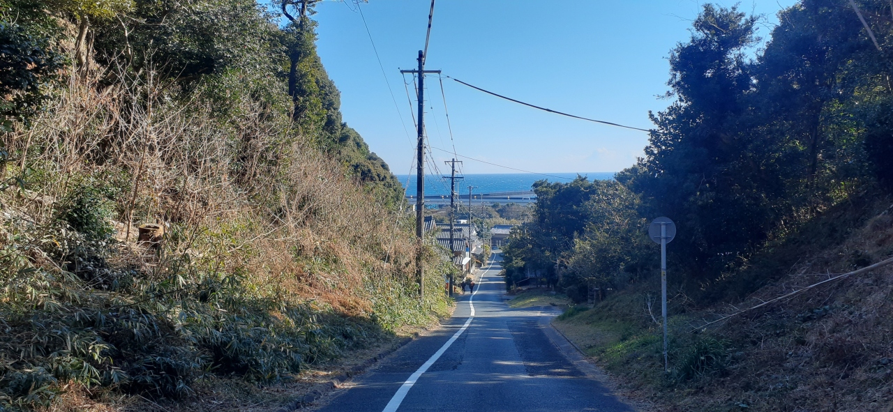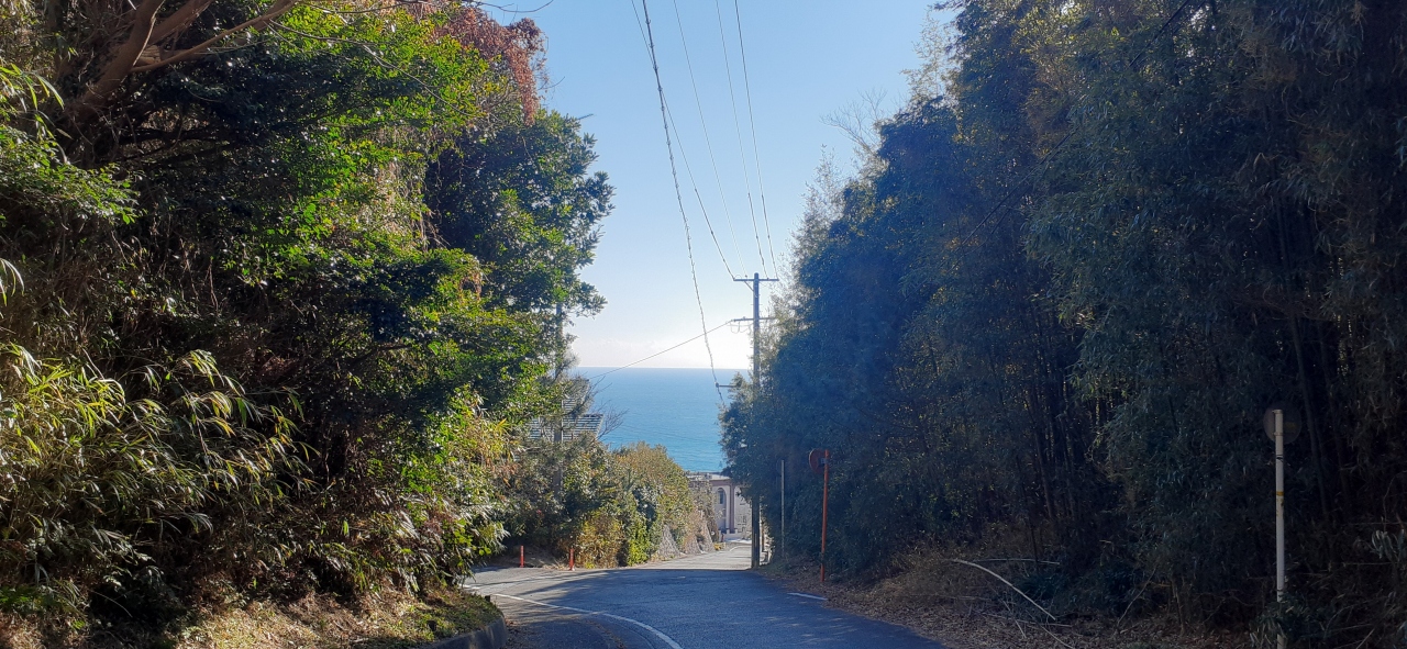現在は国道は別に作られ、旧潮見坂は「おんやど 白須賀」の前の道路から車1台通るのがやっとの細い道を海岸に向かって下っていきます。