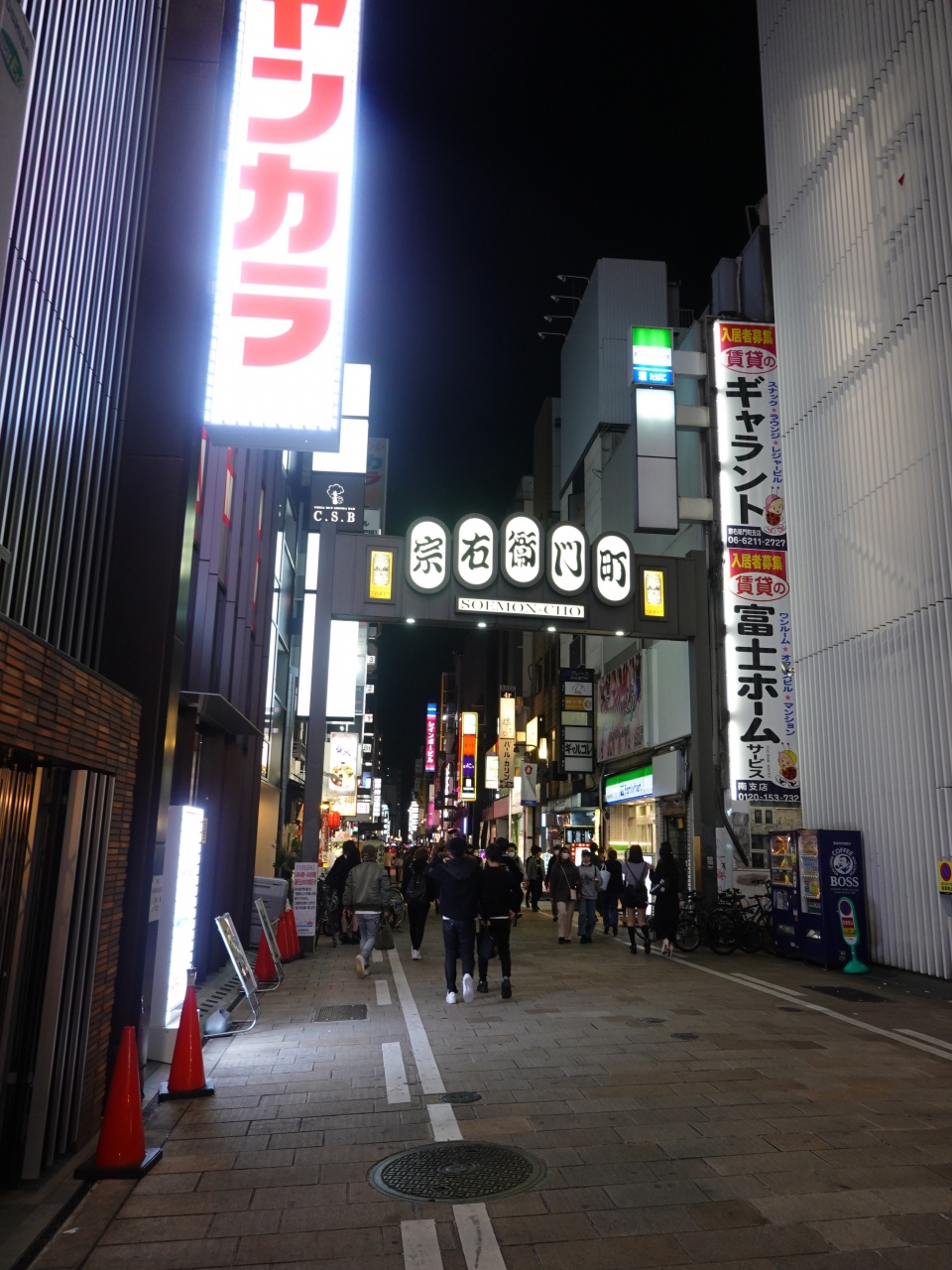 宗右衛門町は江戸時代に起源をもつ歴史ある街です。メインとなる宗右衛門町通りは、道頓堀の北側を東西に走っています。観覧車でお馴染みのドン・キホーテ道頓堀店がある通りになります。飲食店が多く飲み屋街という印象ですが、一見さんにはちょっと入りにくい印象のお店も多いと感じました。