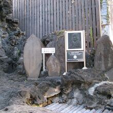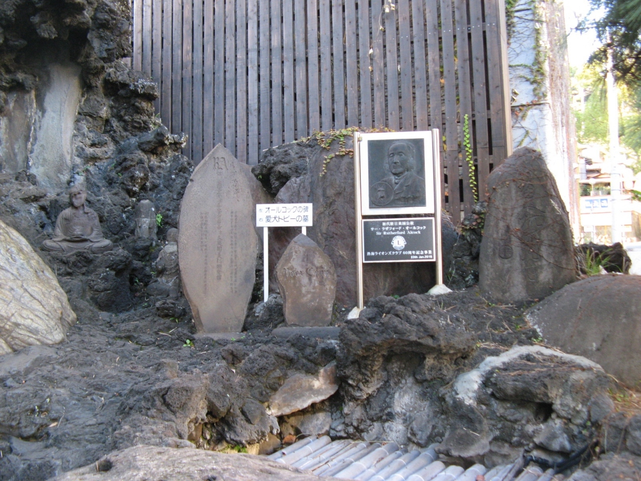 JR熱海駅から歩いて15分ほど、大湯間歇泉の横に「オールコックの愛犬トビーの墓」があります。現地にあった説明板によると初代駐日英国公使オールコックの愛犬トビーが間欠泉で大火傷を負って死んだ際、里人は人の死と変わらないやりかたでトビーの葬儀を行い弔ったとか。“Poor Toby”と刻まれた墓碑はオールコックが英国から送ってきたものだそうで、オールコックがトビーを愛していたことがよく判る逸話です。