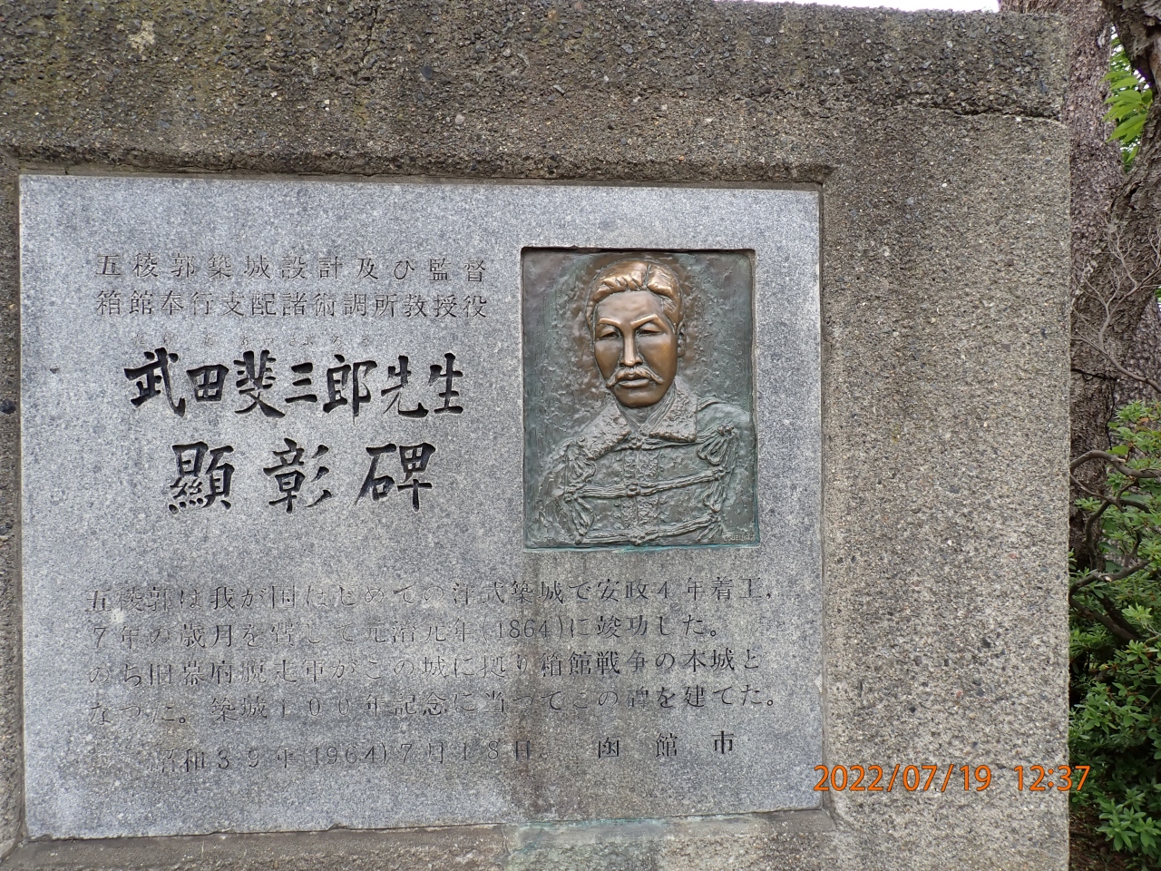函館市観光で立ち寄りました。武田斐三郎顕彰碑は、五稜郭跡内にあり、二の橋を渡って函館奉行所の建物に向かって進むと左手にありました。五稜郭の設計・建設に携わった人で、明治時代にに苦労して陸軍士官学校を開校させた人でした。日本陸軍創設は過酷な仕事だったそうで、健康を害され亡くなったそうです。