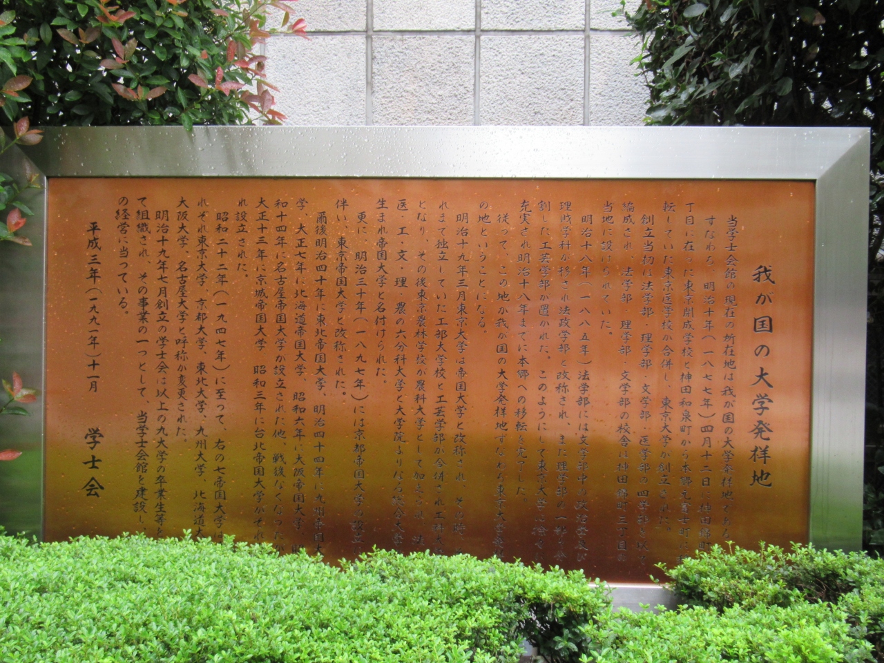 東京大学発祥の地の石碑は、東京の学士会館旧館の正面玄関脇に建っています。