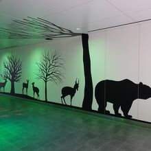 「ルーセントアベニュー」は、名古屋駅地下街からルーセントタワーに向かって北に延びる約290メートルの地下通路です。壁や天井に、動物や鳥、蝶などのシルエットが描かれ、様々な色の光で照らされています。日曜日の夜ですが、行き交う人はほとんどおらず、作品や光景を堪能することが出来ました。