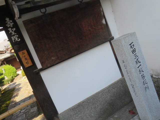 拝観できない寺院が多い妙心寺の塔頭の中で、こちらの寺院は拝観できます。何といってもこちらは、石田三成一族の菩提所ということで、山門の前に石碑があります。狭い境内の参道ながら、両端に松の木が植えられて、よく手入れされていました。