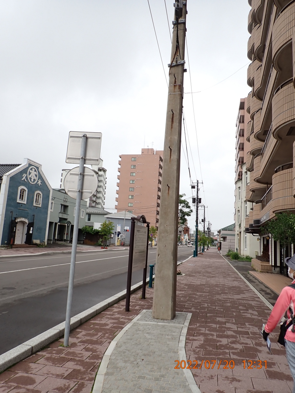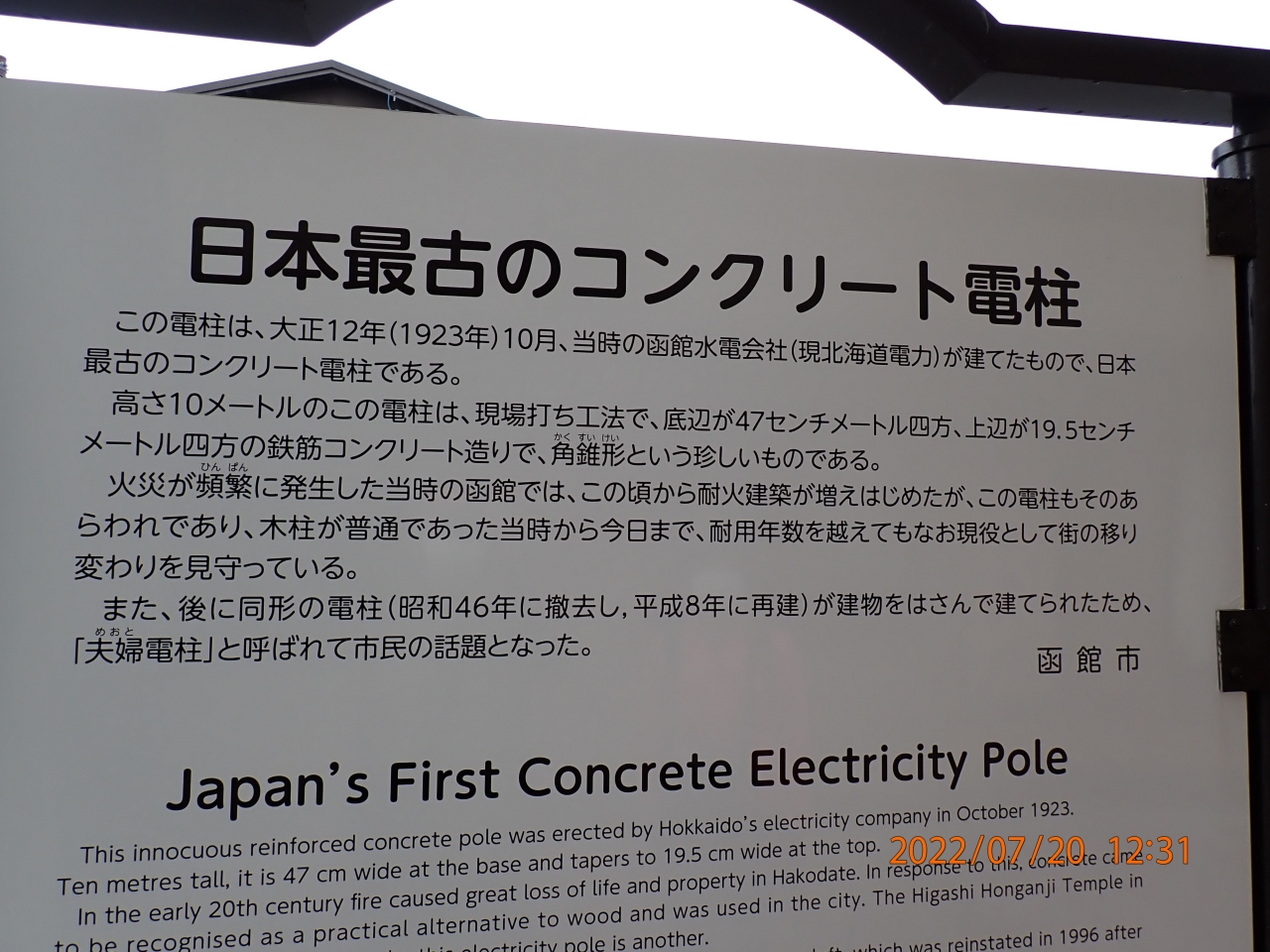 函館市観光で立ち寄りました。日本最古のコンクリート電柱は、開港通り沿いに1本とすぐ近くにもう1本建っていました。高さは10mもあるそうで、四角い電柱と言うのを初めて見ました。1923年に当時の函館水電会社(現在の北海道電力)が建てたものだそうで、約100年とはすごいです。
