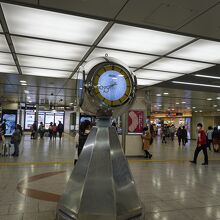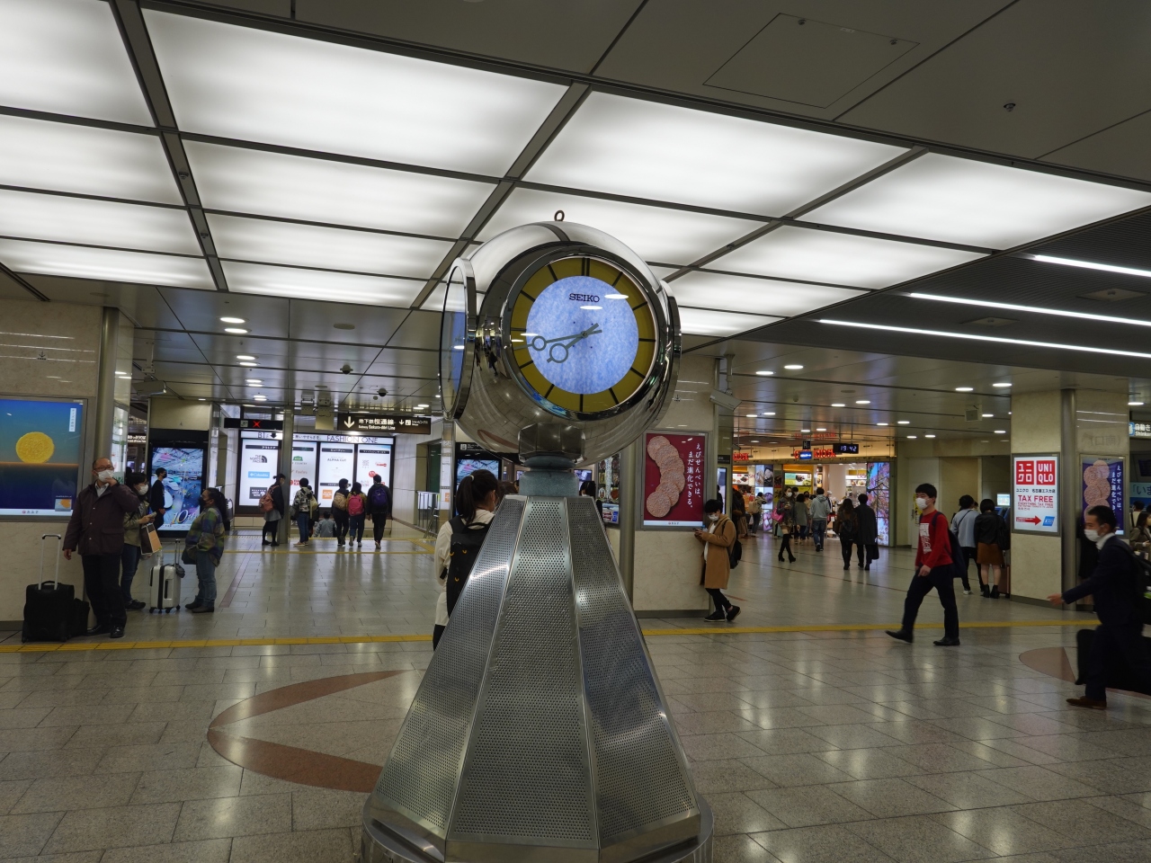 新幹線の改札を出てすぐの場所にあり、金の時計に比べると待ち合わせの人が少ないと感じました。こちらは吹き抜け空間ではないので、文字盤の位置がそれほど高くはなく、金の時計ほど目立ちません。金の時計がシチズン製なのに対して、銀の時計はセイコー製なのがっ興味深いと思いました。