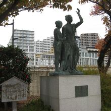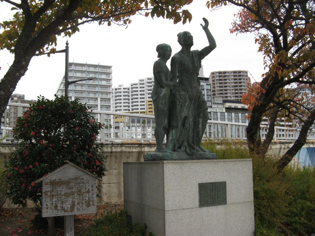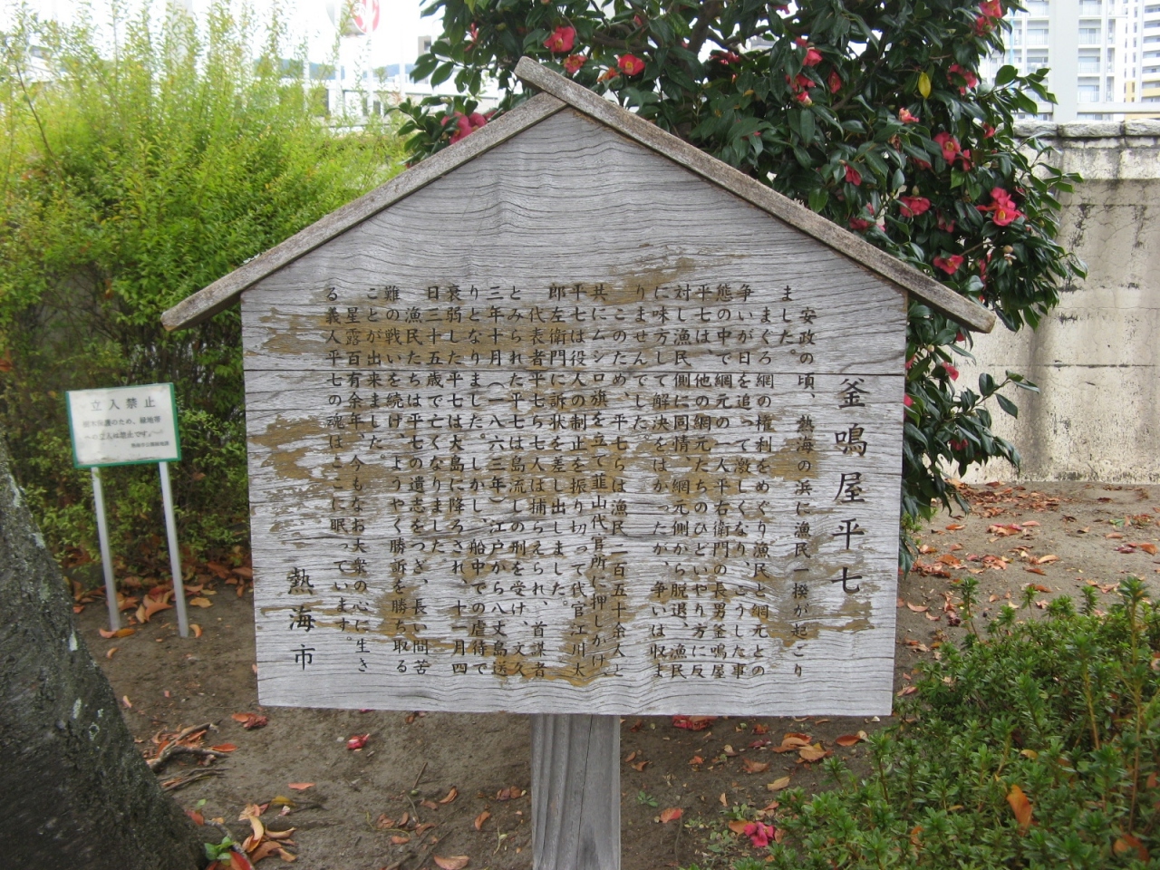 熱海駅から歩いて20分足らず、熱海サンビーチの南端側にあるムーンテラス展望デッキの階段に「釜鳴屋平七夫妻像」がありました。釜鳴屋平七は江戸時代末、まぐろ網の権利を巡って騒動が起こったときに漁民の先頭に立ったことから首謀者として捕えられ島流しとなり35歳の若さで亡くなった人物だそうです。像は平七夫婦が寄り添うように造られて素敵だなあと思いました。