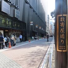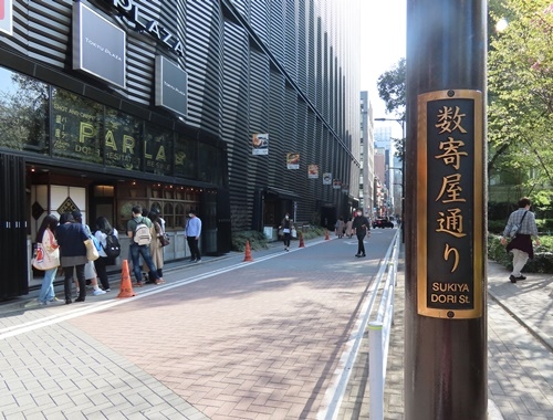 銀座への入り口とも言える数寄屋橋交差点から一本西側で東急プラザと数寄屋橋公園(銀座五丁目)の間を南西に新橋方向に伸びるのが数寄屋通りです。JR・首都高に対してはほぼ並行に伸びてはいますが、完全に並行ではないので銀座八丁目に達したところで途切れてしまうようです。