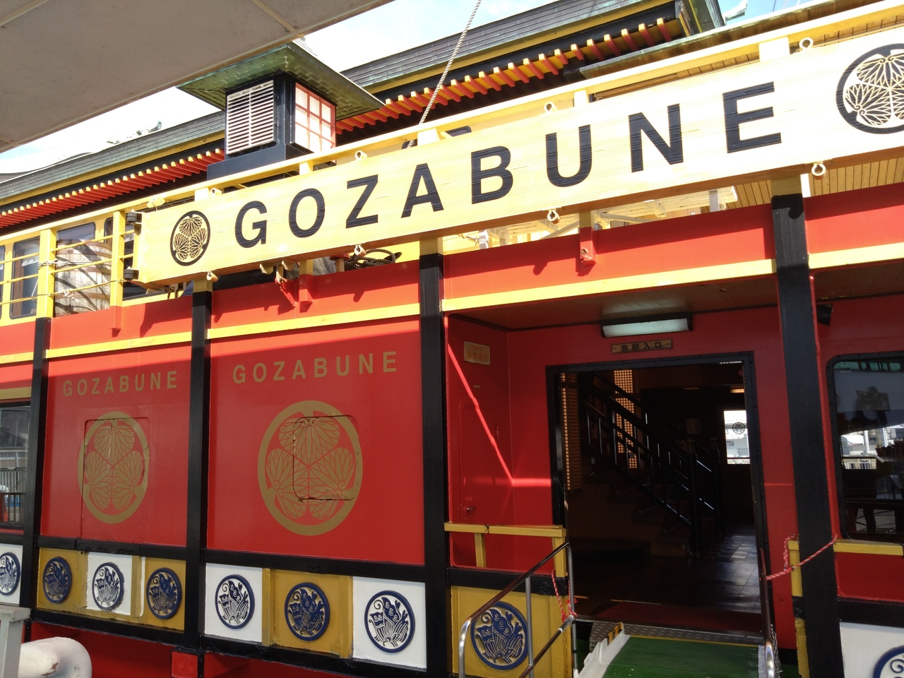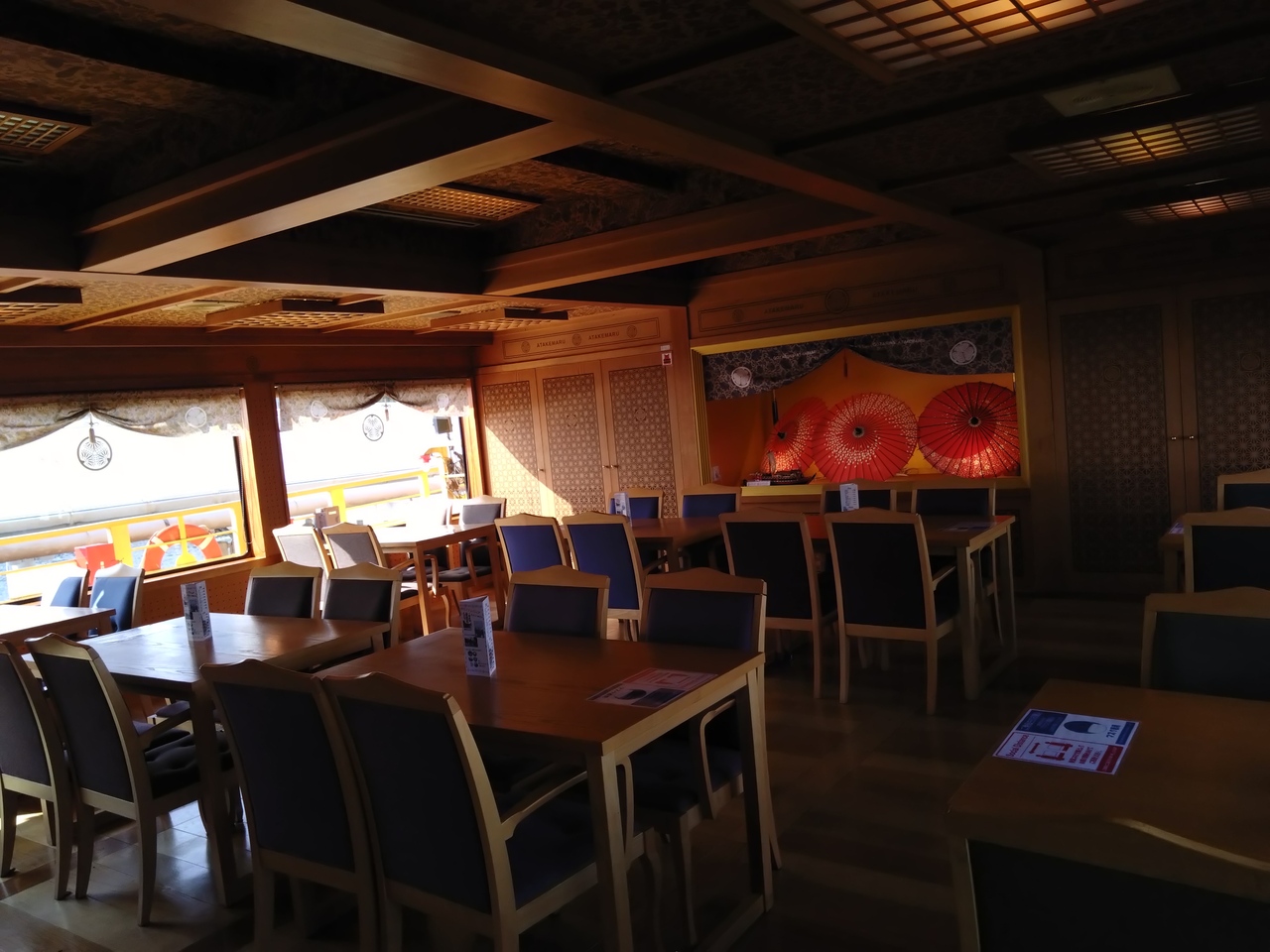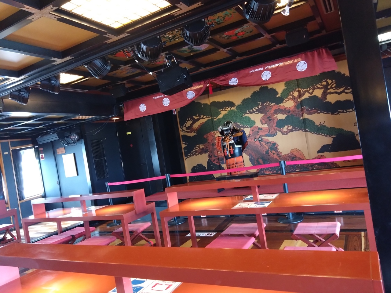 御座船!なかなか面白い船内!これは外国の観光客に受けそうな和テイストで楽しめます。軽食なら船内で買えるので、1時間弱のクルーズで景色を見ながら、あっという間に終わってしまいました。他にも食事付クルーズもあるので、予定に合わせてクルーズの種類が選べます。
