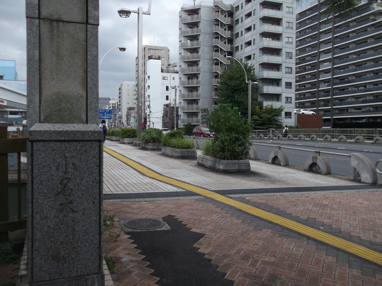 地下鉄新宿線住吉駅から四ツ目通りを南に歩いて7分ほど、小名木川に架かる橋です。小名木川に架かる橋の中でも幅が広く、両方向2車線ずつで交通量も多いですが、歩道も広いので歩きやすいです。橋のたもとには、五百羅漢道標と五本松跡の石碑が建っていました。