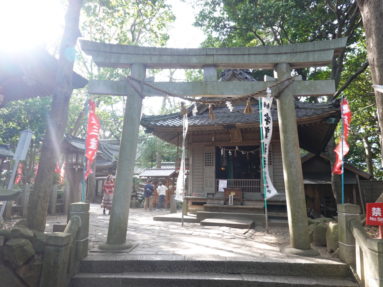 竹島にある「八百富神社」の境内神社の中で、もっとも大きな社殿を有するのが宇賀神社でした。竹島橋を渡って竹島に渡り、石段を登ると最初に宇賀神社が現れます。穀物の神であり、商売繁盛のご利益があるということです。周囲を覆う緑や社殿前の石畳が、一層厳かな雰囲気を作り出していると感じました。