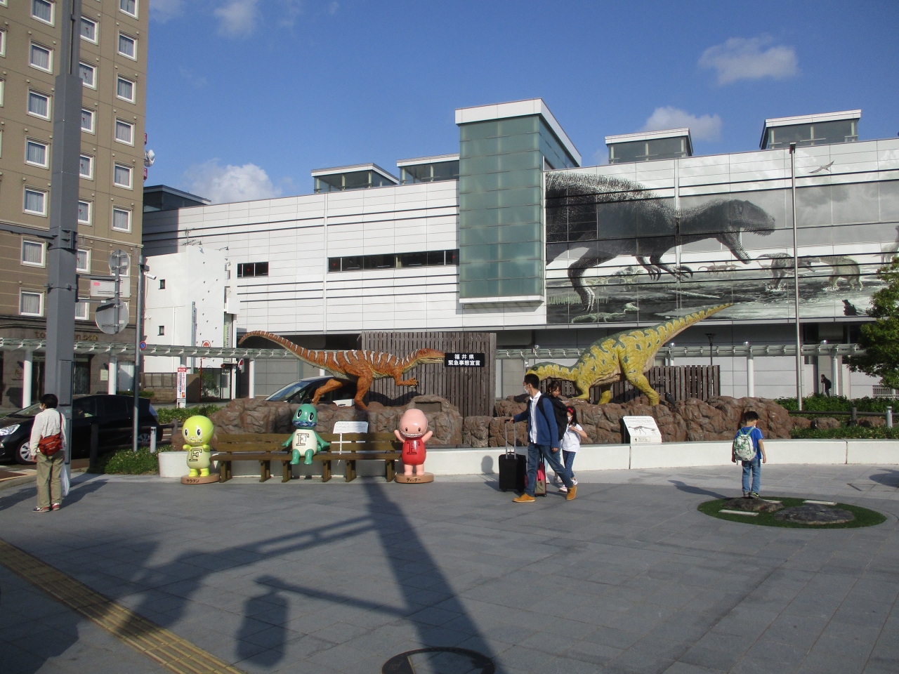 JR福井駅前に恐竜のモニュメントがありました。特に、子供達には好評なようで、地元ろ思われる子供連れファミリーがやって来て、記念撮影スポットになっていました。広場の一角には恐竜案内所のテントが建っていました。全国的に珍しい駅前の広場でした。