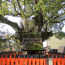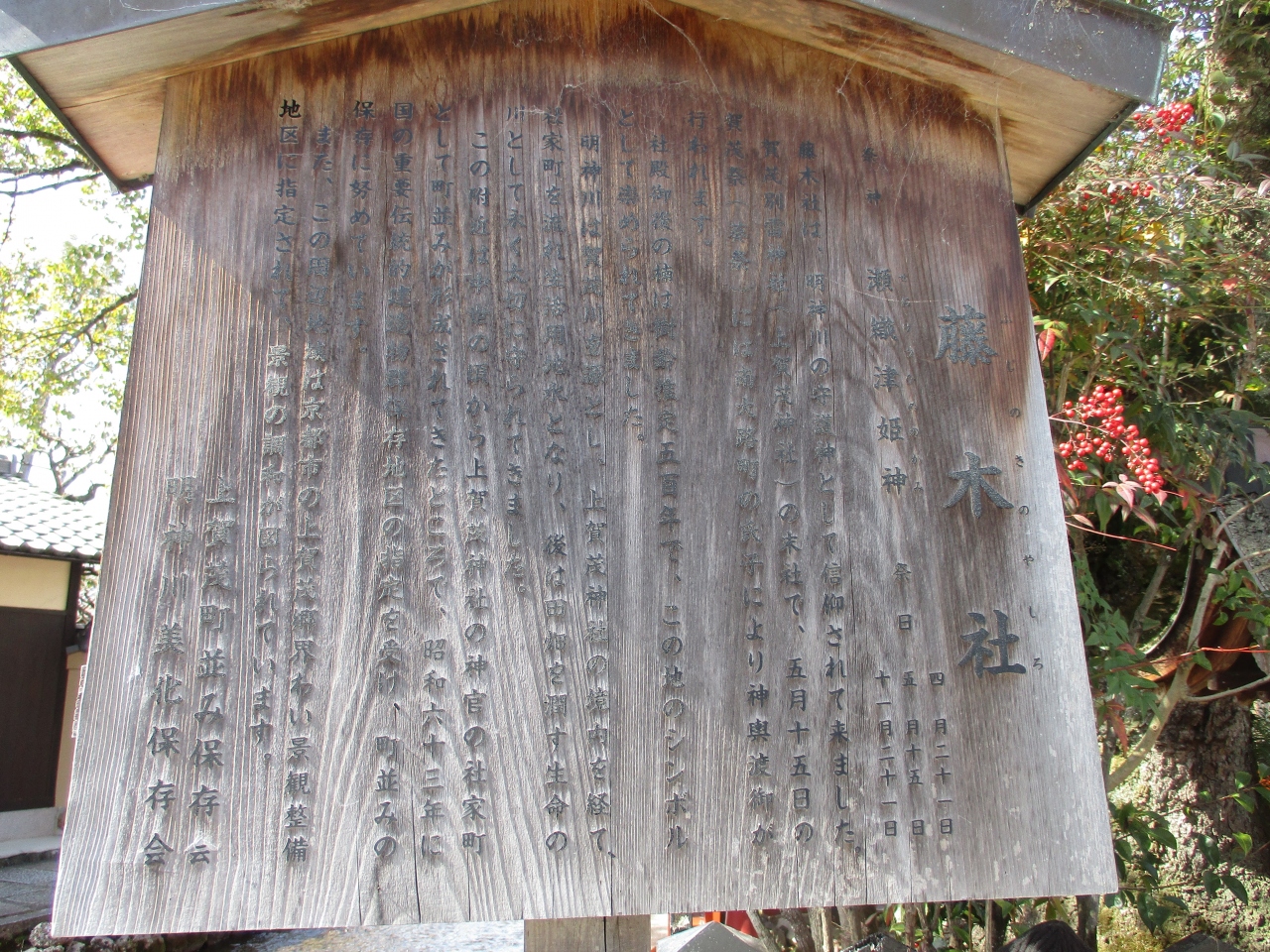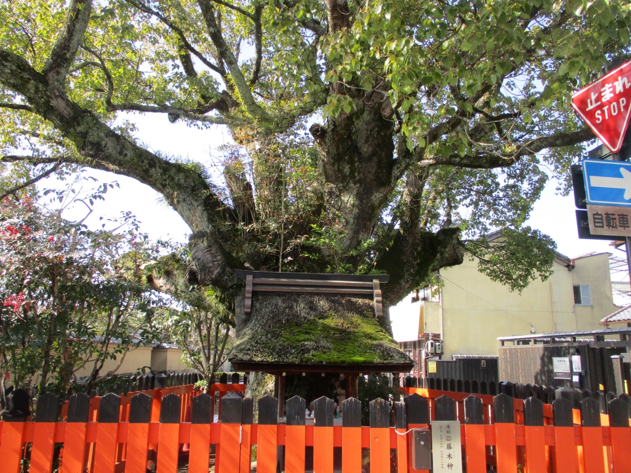 上賀茂神社から太田神社に向かって風情ある明神川沿いの道を歩いていると、巨大なクスノキと小さな苔むす祠が印象的な「藤木社」に着きました。周辺は整備されていてベンチもあります。藤木社は明神川の守護神で、上賀茂神社の末社です。