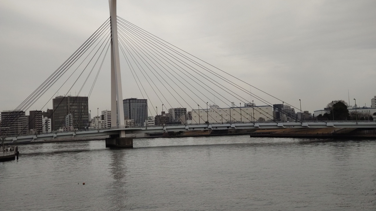 八重洲口から月島へ向かう際に渡る橋の一つです、隅田川に架かり美しい吊り橋です、隅田川はフランスのセーヌ川の友好関係からフランスが設計したとか、1990年代に架けられた比較的新しい橋です。主塔が美しくかなり遠くからでもそのシルエットを観ることができます