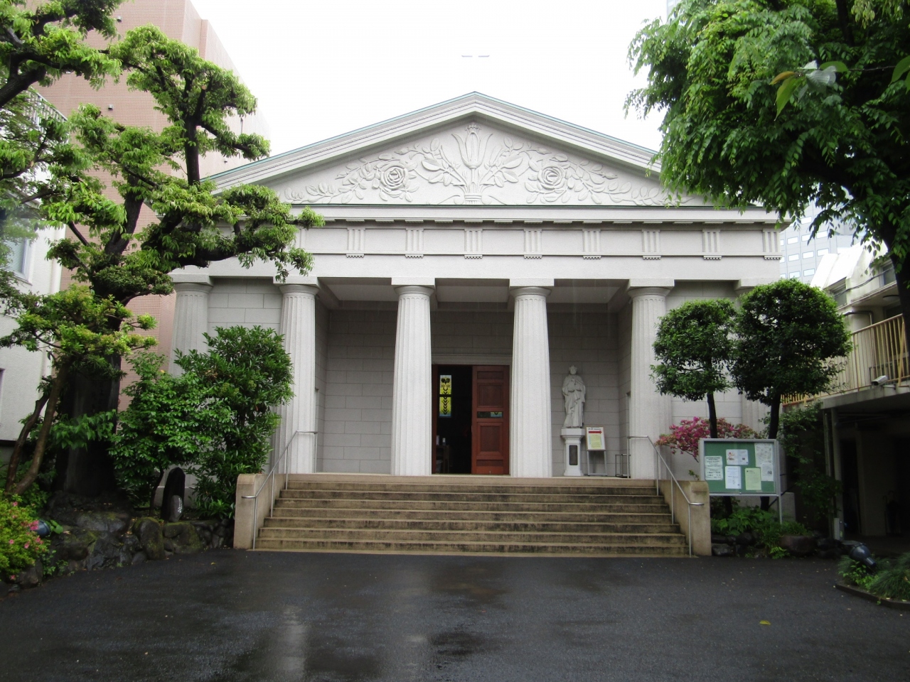 居留地中央通り沿いにある東京最古のカトリック教会で、正面に構えるパルテノン神殿を思わせるギリシャ建築様式の聖堂は優雅さを感じる建物です。