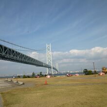 舞子から明石海峡大橋を渡って淡路インターチェンジで下りて道の駅あわじから明石海峡大橋を見上げました。芝生の広場の向こうに青い海その上をまっすぐ伸びていく吊り橋。お天気だったこともあり印象的な光景でした。建設には10年かかり、その間に、大震災も経験。建築にたずさわった方へのリスペクトを感じます。