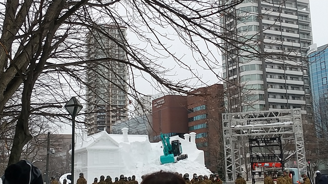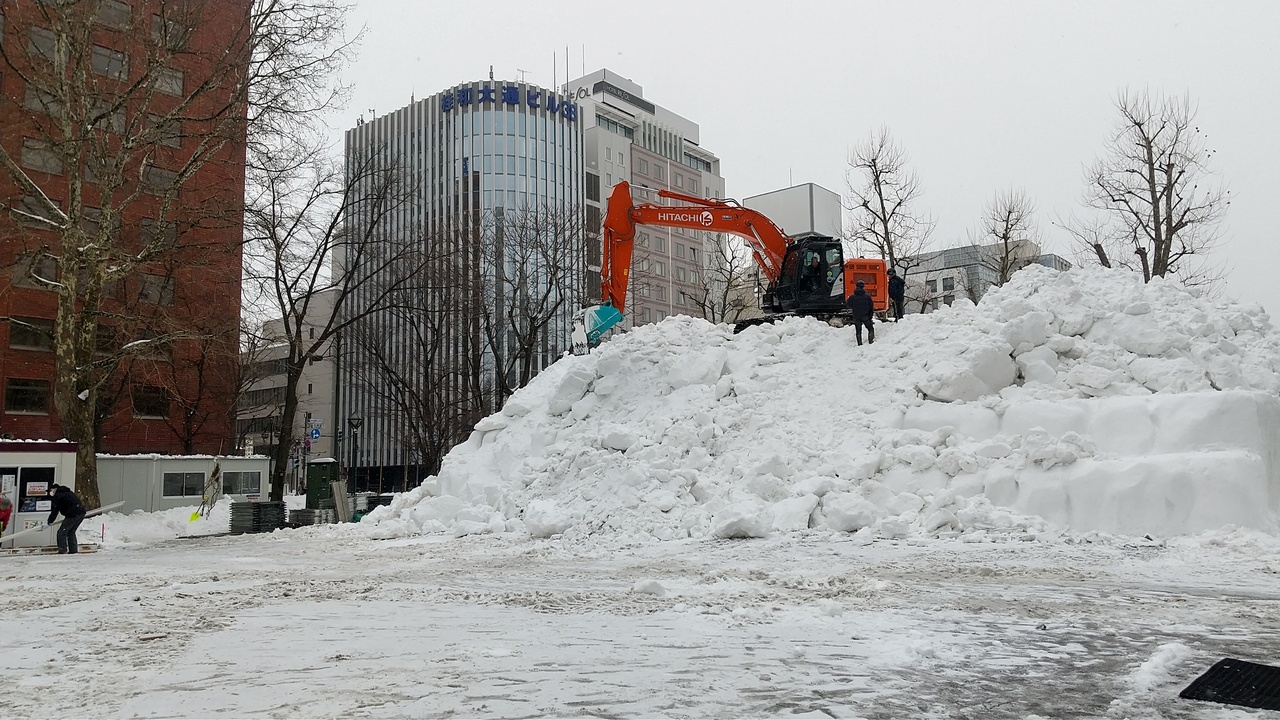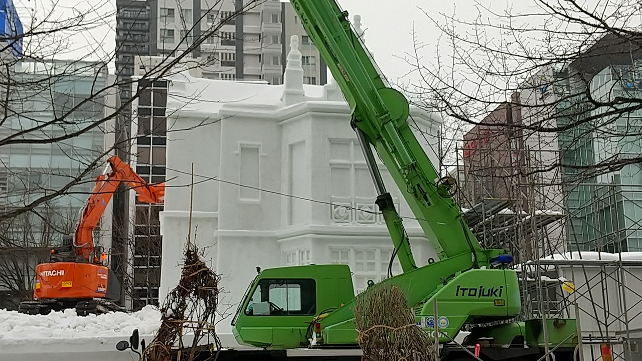 シャベルカーや重機が入り雪まつりの華やかさは呆気なく終わっている様子でしたがテレビ塔から離れた場所の雪像は観る事ができ解体される様子が見学できました。快晴できらきら輝く雪と青空で観光客も沢山いました。